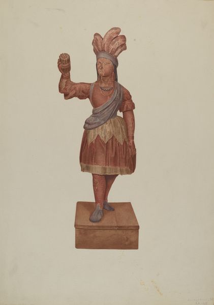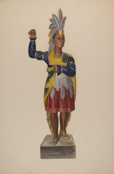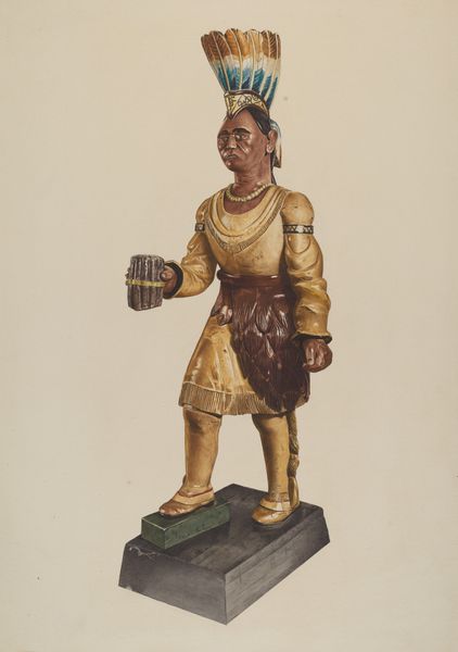 Editor: We're looking at Einar Heiberg's "Cigar Store Indian," created sometime between 1935 and 1942. It's a watercolor and possibly some other media, depicting a sculpture – likely wood. My first thought is the peculiar disjunction between the sharp detail and the very… muted palette. It feels somehow both precise and indistinct. Curator: Indistinct precisely because of the interplay between the forms depicted and the rendering, wouldn't you say? Note how the figure’s idealized anatomy contrasts with the objectness of the cigar store figure—a tension emerges. Editor: Yes, it strikes me that Heiberg captures the *idea* of this figure more than its physical presence. The details—the feathered headdress, the tomahawk—they're all present, but rendered in a way that feels almost… nostalgic, like a faded photograph. I'm more intrigued by what this reveals about the commercial context it evokes. Cigar store Indians were essentially advertising tools. Curator: Intriguing, isn't it? We must also recognize the layering of representations: a drawing *of* a sculpture, which is itself a representation of a person. The semiotics of display are also heightened here. What is not seen? What context does this piece deny to become more aesthetically intriguing? Editor: The sculpture itself, undoubtedly, was fashioned from a readily available material, probably carved, and then painted—likely by skilled but perhaps unsung laborers. And how the labor of Indigenous carvers or communities was likely disregarded or subsumed by the figures these represented in history, too. Curator: Precisely! What seems absent is the perspective of Native communities on this cultural appropriation and its role in commercial imagery. What this drawing excels in depicting is the semiotic value inherent in that absent perspective—making it all the more evident. The structure carries all the weight of the gaze and context around this. Editor: Thinking about the materials then, reminds us of those colonialist roots, where Indigenous cultures became commodified… How does Heiberg’s aesthetic choices engage with or critique this troubling legacy? I keep thinking about this tension between medium, maker, and subject. Curator: Indeed, by rendering the subject so… delicately, in watercolor, the drawing seems to be asking us to consider not the brute physicality of the original carved object, but its symbolic function within a larger social narrative. A kind of distancing effect, maybe. Editor: Perhaps, and in doing so, makes a comment on art-making in an era still wrestling with social narratives and tensions around representation. This is a curious drawing. Curator: Very. A curious encapsulation of signs and meaning, material culture, and a complicated subject, to say the least.