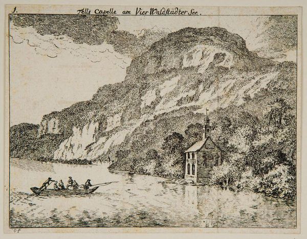 Curator: Salomon Gessner, born in 1730, presents us with "Near Meiringen," a landscape rendered with delicate lines. Editor: There's a stark contrast here; the immensity of the mountain looming over these humble dwellings. It feels almost oppressive. Curator: Consider the technique. Gessner uses etching to create a play of light and shadow, emphasizing the compositional balance between the natural and the man-made. Editor: Etching makes me think of the physical labor involved. The acid biting into the metal, the repetitive strokes—it's a slow, deliberate process to capture this scene. And what materials were available? Where did he source them? Curator: Precisely. And the way he's structured the scene—foreground, middle ground, background—it draws the eye towards the church spire, a symbolic anchor. Editor: Perhaps, or perhaps it signifies the church's socio-economic power over the small village itself. Curator: Intriguing. It seems even the most seemingly simple landscapes can spark multiple interpretations. Editor: Exactly. It's in understanding the labor and context we unlock deeper meanings from this natural scene.