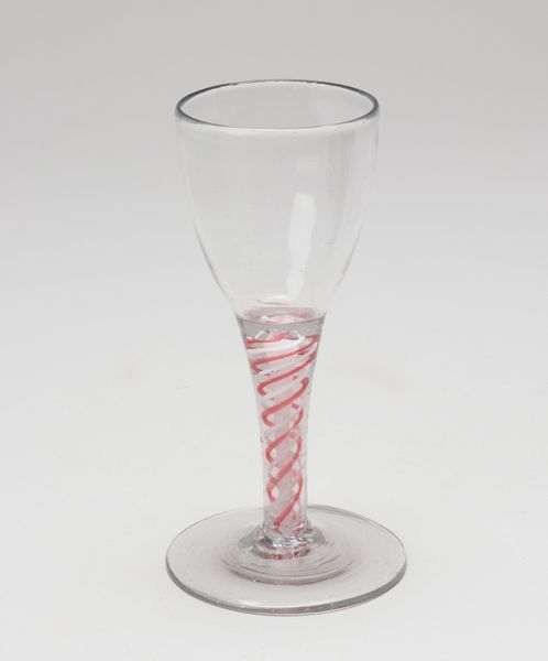 Editor: Here we have an intriguing "Cordial Glass" dating back to the 18th century. Its anonymous creation from glass now resides at the Minneapolis Institute of Art. I'm struck by the spiraling design in the stem—it draws the eye in a playful, almost dizzying manner. What catches your attention? Curator: The helical design, rendered in delicate glass, provides a fascinating exercise in form and function. Notice how the curve repeats itself in continuous fashion; the foot echoes the circular opening of the glass. The clear glass lets us assess how light plays across the entirety of its form, its surface texture, wouldn't you say? Editor: Yes, absolutely. The translucence really emphasizes the light and shadow. Does the quality of the glass suggest anything about its creation or purpose? Curator: Certainly. The clarity and evenness of the glass reflect the advancements in glassmaking of the 18th century. Observe how thin and even the glass is in the cup portion, how the continuous spiral maintains equal spacing. Consider this glass's volume: what function do you hypothesize it served in a Georgian social ritual? Editor: Perhaps for a special liqueur or aperitif, something savored in small quantities. Curator: Precisely. The emphasis lies not just in containment but in display, enhancing the experience through visual elegance. A fascinating interplay of utility and artistic expression, would you agree? Editor: Absolutely, I see how much the simple structure communicates. It’s been fascinating to look at the form and materiality and forget the need to impose cultural interpretations.