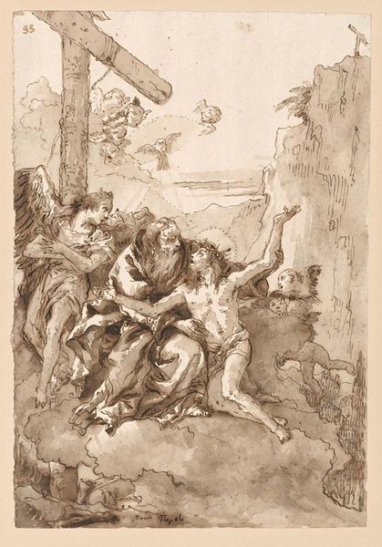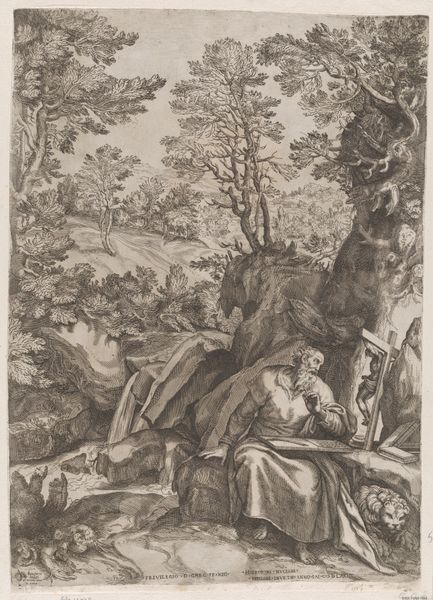 Curator: The moment you first gaze at Domenico Campagnola's pen and ink sketch, "The Hermit Saints Paul and Anthony Receiving Bread from a Dove," created around the 1530s, you’re drawn into a deeply spiritual scene. What strikes you about it? Editor: The energy, definitely. The linework has a frantic, almost feverish quality, especially in the trees and radiating light. It creates an atmosphere that is both mystical and slightly unsettling. Curator: Precisely. Campagnola places the hermits within a landscape reflecting a period of religious and social change, which idealized simplicity and devotion. The image taps into the public's spiritual anxieties of the time. Editor: Tell me more about the figures. Paul and Anthony are almost caricatured, with exaggerated musculature and poses that convey reverence, bordering on theatricality. Look at the positioning of their hands and the light. It's meant to guide our focus to the divine miracle unfolding before them, the dove and the offered bread. Curator: That dove represents divine intervention, an answer to their prayers. The placement within a rugged, almost untamed wilderness, speaks to the rewards of religious asceticism away from the comforts of society. These isolated hermits, removed from worldly concerns, became symbols of devotion. Editor: But look how deliberately he's structured the composition around the landscape and figure dynamic. The textured linework contrasts with the lighter, more open areas, which visually creates a play of light and shadow to animate the drawing surface. Curator: And to your point, the dynamic linework isn't just stylistic. Campagnola deliberately evokes a mood resonant with the tumultuous religious climate, reaffirming faith but hinting at the challenges faced by those committed to their beliefs. Think about the patronage of the church—artworks like this could remind people of the church’s benevolent influence. Editor: It's fascinating how the raw immediacy of the ink amplifies both its emotional and religious dimensions. Thank you, that’s a great interpretation that emphasizes Campagnola’s genius and the social dynamics in play. Curator: A pleasure. Hopefully, our exploration provides another perspective for approaching artworks that initially strike us at first glance.