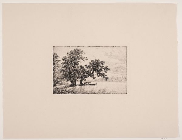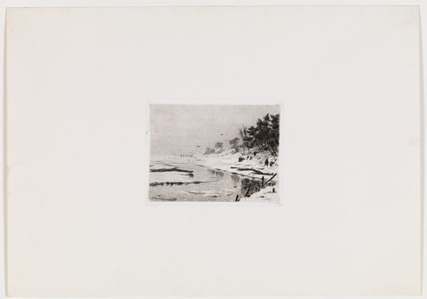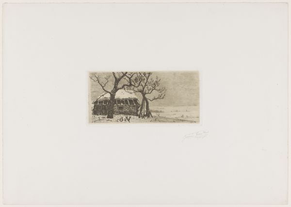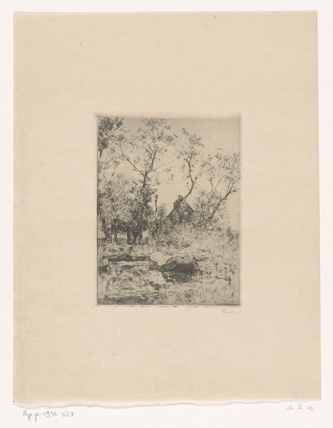 Bernhard Ulrik Middelboe made this landscape with a woman carrying a basket etching, likely at the turn of the 20th century. It captures a woman in a rural setting, carrying what appears to be foraged goods. During this time, women in rural settings often had limited social mobility and were confined to domestic and agricultural roles. The artwork subtly acknowledges the labor of women in rural economies. The woman is anonymous, her back turned, suggesting a focus on her role rather than her individuality. A dog accompanies her, a symbol of loyalty, but also perhaps underscoring her solitude in her daily tasks. This piece is a quiet reflection on the lives of working women in the Danish countryside, and leaves us to consider the narratives of those often unseen in the grand narratives of history.