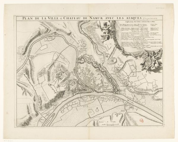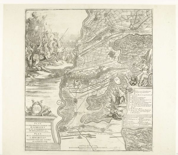 Editor: Here we have "Slag bij Malplaquet, 1709" created in 1709 by Jacobus Harrewijn, using drawing and printmaking techniques with ink and engraving. What strikes me immediately is how detailed and intricate the whole composition appears, but in a very ordered, almost mathematical way. What do you see in this piece? Curator: What captivates me first is the interplay between line and form. Observe the precise articulation of the lines; how they delineate space and suggest depth through variation in weight and density. The engraving operates on a formal level as a constructed reality. Consider how the artist utilized the constraints of the medium to portray a landscape filled with warfare. Do you notice how the varying line weights impact the readability of the image? Editor: I do. The thicker lines definitely draw my eye, making the paths and larger troop formations stand out, almost creating a sense of hierarchy. Are you suggesting that the aesthetic choices of the engraver enhance the legibility of this complex image? Curator: Precisely. Furthermore, consider the use of texture and pattern. Note the distinct mark-making used to depict different elements: forests, fields, troop deployments. How do these choices affect your perception of the overall image? Editor: They definitely bring a sense of variety and break up the potential monotony of a map-like image. I’m starting to see that what I perceived as a dry depiction of war actually involves sophisticated techniques to draw in the viewer. Curator: Precisely! By understanding how the composition affects our understanding of a work of art, we unveil new paths for interpretation, new experiences!