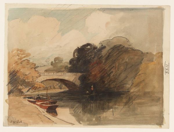 Curator: Here we have Camille Pissarro's "Pont Corneille à Rouen," a cityscape rendered in watercolor, pen, and drawing techniques on paper. Editor: It's a tranquil scene, isn't it? The muted colors and wispy brushstrokes create this almost dreamlike impression of the city and river. I'm drawn to the reflections on the water – they really capture the essence of light and atmosphere. Curator: Precisely. What's striking about Pissarro's cityscapes is their position within Impressionism and plein-air practices. While capturing everyday life, they underscore the modernization and industrialization occurring at the time. The bridge, in this sense, becomes a symbol of progress and connectivity. Editor: Right, but the hazy quality almost softens that progress, doesn't it? Rather than celebrating industry, it seems more focused on how industrial structures integrate into the landscape. The workers or people aren't prominent; nature, and its relationship with city infrastructure takes precedence. I am particularly intrigued by how gendered roles played out during this period: women were pushed to capture domestic scenes, and Pissarro being a male artist had more acceptance in society, being able to paint an industrial area. Curator: That's a fantastic point. It pushes us to consider whose narratives were being centered during the period, how public spaces were gendered, and what stories were erased or never even had the space to exist within art. Pissarro does capture that, not just literally within the image, but also implicitly, highlighting that contrast. Editor: There is a socio-political relevance about urban growth. You get a sense of how society shifted at that moment through a gaze which seems devoid of direct commentary or judgment; perhaps reflecting a deeper commentary on rapid transformation during this period. What seems evident in the image is the integration and effect that had within the cultural transformation in society. Curator: This watercolor invites reflection. It asks viewers to see how places impact individuals, influence lives, and become woven into the tapestry of time and memory. The social fabric behind infrastructure development at the time in Rouen needs to be questioned through his paintings. Editor: It is also fascinating to think that this image represents a fragment in time—almost fleeting and transient because society keeps evolving, reshaping perspectives through an array of intersectional issues.
