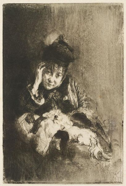 Editor: This is "Mother and Two Infants," a charcoal and pastel drawing by Jean-François Millet. The hazy rendering creates an overall muted, somber feeling. How would you interpret the composition? Curator: From a formal perspective, note how the artist uses contrasting values to define the figures against the background. The darkest tones, delineating the mother’s form, are juxtaposed with lighter areas highlighting the infants. The arrangement presents a tightly-knit structure—visually and emotionally binding the subjects together. Observe the composition itself; it’s almost a pyramid, a classic form that conveys stability, though instability appears suggested by her wearying pose. Editor: So you’re suggesting the structure plays with contrasts - of stability, instability, darkness, and light? Curator: Precisely. Consider, also, the materiality. The charcoal and pastel lend themselves to softness, almost like memory. Does that choice strike you as purely representational or something more deliberate? Editor: That's a great point. The softness adds to the tenderness and almost dreamlike quality. Is this blurring stylistic? Curator: It pushes against realism. Think about the tonal relationships – the mother almost blends with her environment, creating an atmosphere of enclosure and perhaps a sense of constraint. There's a stark contrast between her textured face and simple clothes. Editor: I see that now – so the medium contributes directly to the emotional impact rather than purely describing the scene. Thank you. Curator: Indeed. Focusing on these formal and material aspects deepens our understanding of Millet’s choices and their effect.