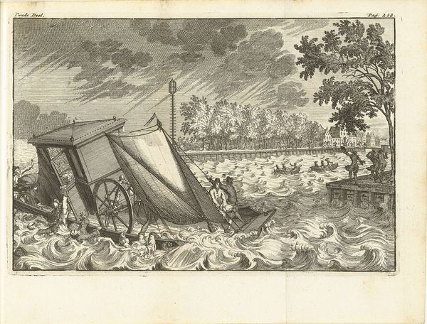 Curator: Look closely at "Hunters Driving Wild Geese into a Large Net," an etching by Antonio Tempesta created in 1598, rendered in silver. It’s currently housed here at the Rijksmuseum. Editor: Right away, there's this peculiar sense of ordered chaos. The detailed lines, the almost comical frenzy of the hunt… It's teeming with a busy sort of energy, isn't it? Curator: Indeed. The net, dominating the left side, acts as both a focal point and a symbolic enclosure. Think of the net as a form of predetermined destiny or the confines of social structure during that era. What do you make of that contrast with freedom in the wide open landscape around the event? Editor: The contrast almost creates a feeling of being trapped, for the geese certainly, but also maybe reflecting something about us, the viewer, about humans in general. I'm also really drawn to the depiction of these hunters; some in boats, one looks like they are on top of a barrel and others on the ground – a theatrical performance unfolding in silver lines. Curator: You touch on a critical element. The hunters represent the human desire to control nature. Look at the array of figures and their weaponry, all meticulously rendered. Tempesta conveys not just a literal hunt, but a statement on power dynamics and the taming of the wild. The variety of hunters also show a distinct separation of social classes that have different roles to play. Editor: And the dog, lunging forward—that instinctual drive amplified and directed. What a vivid symbol of both natural instinct and human influence over nature! But those poor geese though! They look like a fluffy white tsunami about to crash on the shore! I'm surprised such a scene of slaughter looks kind of cheerful too. Curator: It’s the Baroque aesthetic. Even amidst potential brutality, beauty is extracted. But this image also speaks to cycles – the endless pursuit, the inevitable capture, and the consequences for those caught in the snare. Editor: A pretty morbid thought when it comes to cycles – makes one ponder the human condition a little bit, doesn’t it? Thank you for clarifying and unpacking all of that symbolism and its art historical context. I certainly look at that print in a very different way now! Curator: My pleasure! This work really allows for deep contemplation about not just the relationship with the environment but of our history itself, even four centuries later.