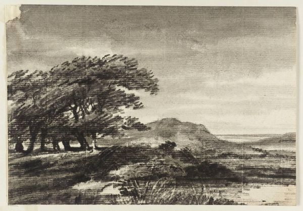 Editor: This is "Round Hill," a print created in 1949 by Thomas W. Nason. It's rendered in black and white and has this incredibly tranquil, almost melancholy feeling. The landscape seems to stretch on forever, even within the frame. What do you see in this piece that I might be missing? Curator: It does evoke that quiet introspection, doesn't it? For me, it's like stumbling upon a memory, something both familiar and fading. The precise rendering, the careful shading—it all feels so grounded, so present. But then you look closer, and there’s this subtle dance between light and shadow that creates a sense of impermanence. Notice the hint of rain on the distant hill - does that alter your impression? Editor: It does add to that melancholic feeling. It's almost as if the landscape itself is remembering a sadness. Is there a connection between the geometric forms of the land with the trees, or does their tension cause the emotional effect? Curator: Absolutely! Consider how Nason uses line to define form. The hill itself, as the title suggests, is softened with a touch, but precise at its borders. But the stand of trees are reaching and wilder. This gives that contrast to the tranquility and introduces a little uncertainty, don’t you think? The precision mixed with the fleeting makes it resonate emotionally. It is as if nature holds wisdom. Editor: I hadn't quite noticed that contrast before. It does feel like the precision helps showcase what parts Nason wants us to observe more than others, using the land almost as a grounding platform, and with a little something fleeting overhead. Curator: Yes, exactly! And sometimes that grounding, that sense of place, is exactly what we need to reflect on the more turbulent, less defined aspects of our own lives. Art, I think, can create mirrors and windows all at once. Editor: It really can. I'm definitely seeing this landscape in a new, more personal light. Thanks so much for your insight.
