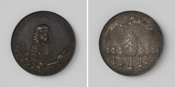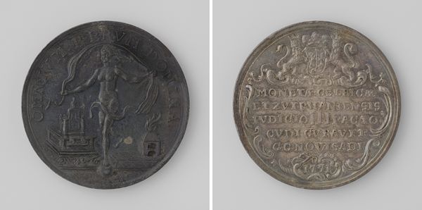 This medal, by an anonymous artist, commemorates the taking of Winnersburg by the Duke of Guldenleeuw. At first glance, the medal presents a study in contrasts. The two sides offer different facets of the same event, united by the circular form, a visual constraint that shapes the narrative. One side presents an allegorical column, the other the city itself, each rendered with a stark minimalism. This simplicity belies the complexity of the historical moment. The column, inscribed with text and topped with a heraldic lion, is a formal emblem, while the city, encircled by fortifications, appears as a network of lines and shapes, each form contributing to the overarching sense of containment and power. The arrangement creates a semiotic interplay, inviting us to consider how power is symbolized and enforced through architecture and heraldry. Ultimately, the medal asks us to consider how victory is not only a physical conquest but also a symbolic one, captured in these carefully rendered forms.