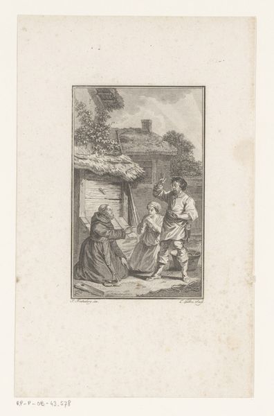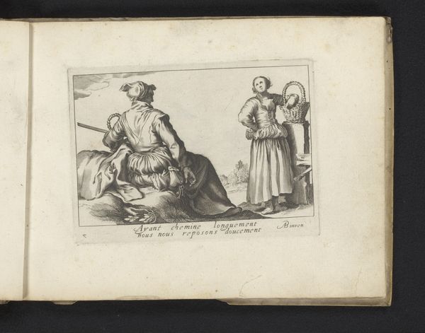 Editor: This is Bartolomeo Pinelli's "Herder en vrouw uit de omgeving van Rome," created around 1820 using pen and ink. It strikes me as a scene that romanticizes rural life, but I wonder if there's more to it than just a pretty picture. What do you see in this piece? Curator: Beyond the romantic idealization, it's crucial to consider the socio-political context. Pinelli, working in the early 19th century, was producing these images for a market deeply interested in Italian national identity. But whose Italy are we seeing? Is it a true reflection, or a carefully constructed image that conveniently omits the complexities of poverty and gender inequality? Look closely at the woman; does she have agency, or is she just a decorative object within the landscape? Editor: That’s a compelling point. I hadn’t considered the potential for an underlying commentary on the roles assigned to men and women within that rural society. Curator: Precisely! Consider her positioning near the water jug, almost a symbol of her domestic duties, compared to the shepherd freely roaming the landscape. Pinelli presents a visual hierarchy, and we need to be critical about the narratives embedded within. Is this Romaticism used to naturalize those differences? Editor: So, by looking at these figures through the lens of gender and class, we can uncover the power dynamics at play in this seemingly idyllic scene? Curator: Exactly. It prompts us to ask whose stories are valued and preserved in art history. Editor: I see what you mean; analyzing the composition with that in mind helps reveal hidden power dynamics within a romanticized vision of the past. Thank you for shedding light on the social complexities within. Curator: It is important to interrogate beyond face value and unearth a broader historical context to gain a critical awareness of these artworks.