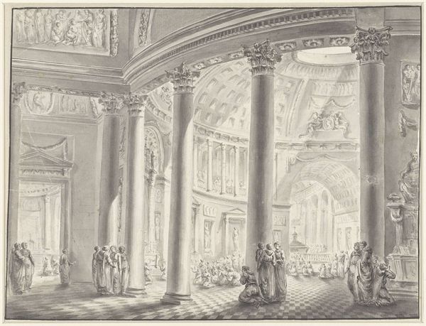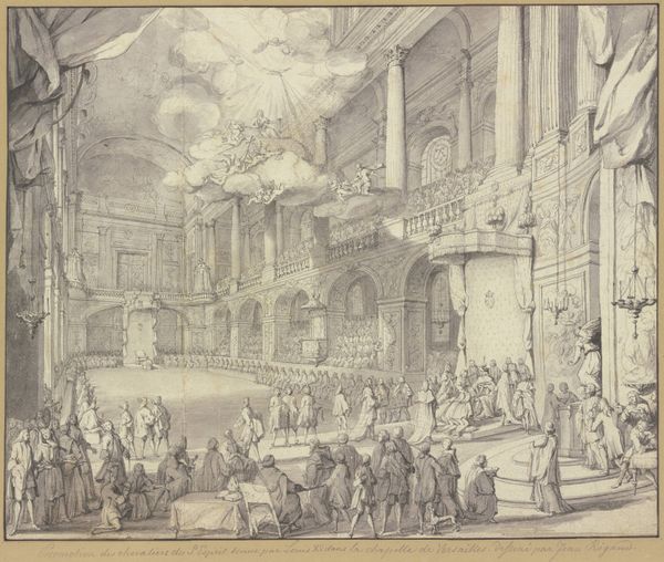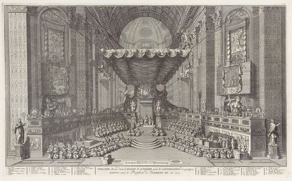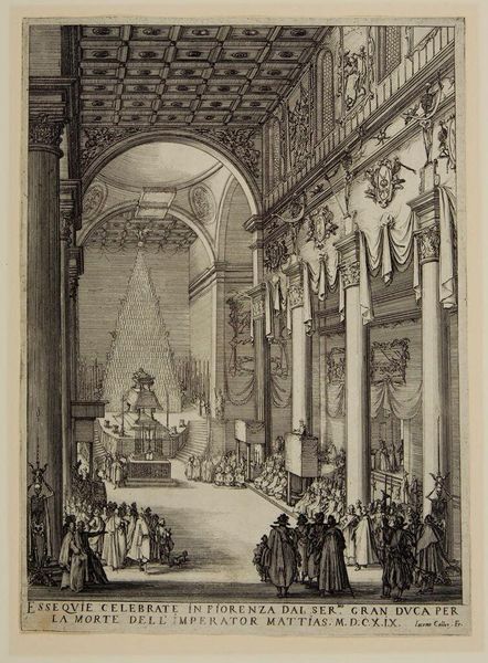 Editor: This is Jacques Callot's "Catafalque of the Emperor Mathias," an etching depicting the Emperor's funeral ceremony. The precision of the lines makes the scene feel grand yet strangely intimate. What strikes you most about this piece? Curator: For me, it's the sheer theatricality. Callot masterfully captures the performative aspect of mourning, transforming grief into a public spectacle. Notice the pyramid of candles reaching toward the heavens, an almost defiant gesture against mortality. Editor: That's a great point. There is a tension between the grand architecture and the small, anonymous figures. Curator: Precisely! It's Callot’s way of reminding us of the individual within the spectacle, lost in the immensity of power and tradition. What do you make of the etching's many emblems and crests? Editor: They feel like markers of Mathias's status and the power he once wielded, now simply symbols. I guess death is the great equalizer. Curator: Exactly! A somber yet thought-provoking piece. It makes me ponder the nature of power. Editor: Me too. Thank you for this perspective!