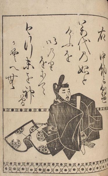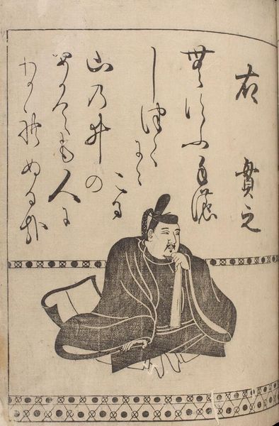 Curator: It has a rather somber feel to it, wouldn't you say? The lines are so stark. Editor: Indeed. This is a page from the KÅetsu edition of "Thirty-Six Immortal Poets," featuring Ånakatomi no Yoshinobu. Hon'ami KÅetsu's calligraphy defines this work, reflecting Momoyama period aesthetics. Curator: I am struck by the printing process itself. Look at the textures, the layering of ink on paper; it speaks to a careful process of production, of skilled labor. Editor: Absolutely. Books like this held immense cultural significance. They helped canonize poets, shaping literary tastes and contributing to the visual culture of the era. The act of collecting and displaying such books became a marker of status. Curator: The materiality is intrinsic to its meaning; the paper's fiber, the ink's composition, all contribute to its value as a cultural artifact. The imperfections themselves tell a story of creation. Editor: A powerful reminder of the socio-political forces that shaped artistic production and reception in that time. Curator: Precisely. It’s so much more than just ink on paper; it is a tangible representation of history and labor. Editor: I agree; it's a testament to the enduring legacy of cultural heritage.