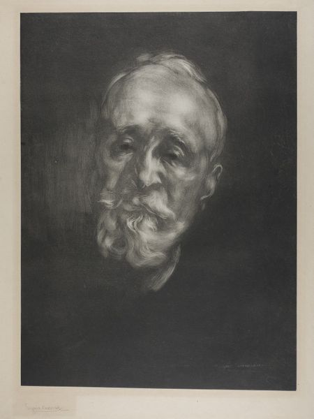 Editor: Here we have "Head of a Man," also known as "Tete d'homme," by Alphonse Legros, done in graphite as both a drawing and a print. It's powerfully somber, mostly because of how dark it is, but that makes me wonder: What do you see in this piece? Curator: This "Head of a Man" carries echoes of traditional iconography, wouldn’t you agree? Notice how the figure emerges from the darkness, the almost complete lack of background emphasizing the face. It brings to mind the visual language of religious art, where the subject is often depicted as a beacon of light, or perhaps a figure weighed down by the world. Do you see how Legros uses light and shadow to create a sense of spiritual weight? Editor: I hadn't thought of religious art initially, but now that you mention it, the almost reverent treatment of his face and beard makes sense. The shadows do seem to carry some sort of meaning. Curator: Yes, consider how facial hair, especially a beard, was a signifier of wisdom, age, and authority in many cultures and religions. This portrait isn’t just about depicting an individual, it's drawing upon a well of cultural memory, evoking ideas of prophets, philosophers, or even a patriarch. It also raises questions. What kind of wisdom does he embody? What has he seen, and what burdens does he carry? Editor: So the symbols point towards universal ideas, despite this being just one man? That makes the drawing feel bigger somehow, heavier, as you mentioned. Curator: Exactly. By understanding these symbols, we’re able to see how Legros connects this specific image to broader human experiences and cultural narratives that endure over time. Editor: That's a totally different way of approaching portraiture than I was used to, much more expansive. Thanks! Curator: My pleasure. Recognizing the cultural threads within art can deepen our appreciation and understanding immensely.
