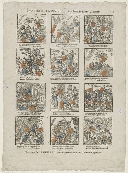 Editor: This is "Hier is thands veel vreugd te vinden, als gy ziet aan deeze vrinden, / In 't onbekend Luilekkerland, een ieder heeft het abondant," a print made between 1806 and 1830 by Johan Noman. It looks like a comic strip, all rendered in these meticulous engravings. What historical context informs this quirky narrative? Curator: It depicts the Land of Cockaigne, a satirical and aspirational vision of a world without labor, where food and pleasure are endlessly abundant. How does Noman's rendition reflect societal anxieties or desires of his time? Editor: I see the overabundance of food, practically growing on trees or falling into people's mouths! Were people actually starving, which made them long for such an imaginary place? Curator: Absolutely. This imagery emerges from a long tradition, gaining particular resonance during periods of famine and social unrest. Consider how printmaking itself made this dream accessible to a wider public. Was it simply escapism, or something more subversive? Editor: I hadn't considered that prints were so easily distributed! Looking at these figures lounging about and gorging themselves… were there societal concerns about wealth distribution or the virtue of hard work influencing this artwork? Curator: Indeed. This idealized land is often shown in contrast to the reality of daily struggle, offering a silent critique of social inequalities and the existing power structures. Does it glorify idleness or expose the absurdity of unending toil? Editor: I never would have considered this just a comic before, thank you! Now I see this etching is doing a lot more than just trying to be funny; it's telling us about people's desires and also critiquing society. Curator: Exactly. Examining such images gives us insight into the values and the social consciousness of the period, revealing how art engages with the pressing issues of its time.