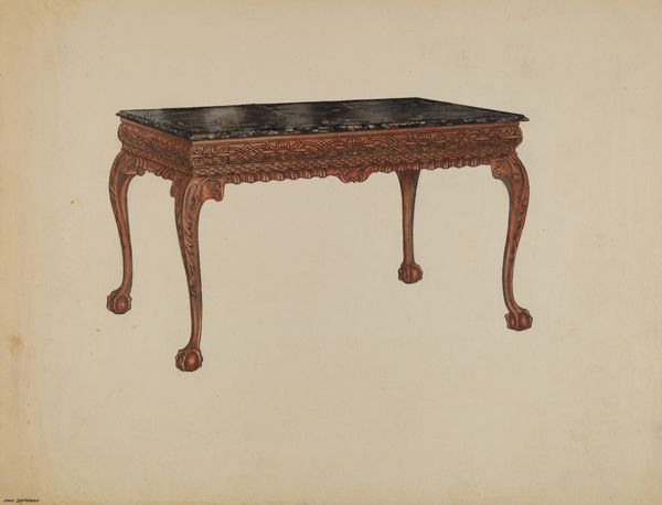 Curator: I see old money in this; something very refined and classical. An echo of a time gone by, maybe even something theatrical. Editor: Well said! What we’re observing is "Card Table," a watercolor work made around 1936 by Louis Annino. Look at how detailed it is. He has rendered every little swirl and turn of the wooden decoration. Curator: Annino certainly had a flair for capturing not just the physical object, but the entire essence of an era obsessed with elaborate refinement. And that walnut sheen – almost sinful! Editor: Yes, that lustrous wood tone speaks to the symbolism inherent in material possessions. For example, the legs on rollers make the table seem as though it were moving towards modernity, yet bound to tradition by its rich and decorative materiality. I would call those feet something that ties into wealth and permanence, like golden calves. Curator: You're absolutely right! Those wheels, those grasping golden feet…there is a very tactile and sensual dimension brought forth in the work. In one view the little rolling casters suggest movement, in another confinement, and the color palette evokes nostalgia—but in the most luxurious, velvety way. Editor: Exactly. Note how Annino contrasts light and shadow to give depth and shape to a piece of furniture. By depicting its material components through meticulous use of form and colour, and by giving us an idea about how it might be positioned within an interior setting, it represents an object that held status and elegance as a piece of history. Curator: The attention to the wood grain alone is astonishing. Every knot, every swirl is accounted for. Did they really use pineapple motifs in those days, or are my eyes deceiving me? But more importantly: who might have gathered at this table? What stories were born around this decorative place? Editor: Perhaps, as they played cards they were oblivious to this level of ornamentation in plain view? Annino truly elevated a simple piece of furniture to this object that transcends simple daily usage to become imbued with its own artistic soul! It carries echoes of history within its frame. Curator: Absolutely. And that's what great art does, right? It whispers secrets.