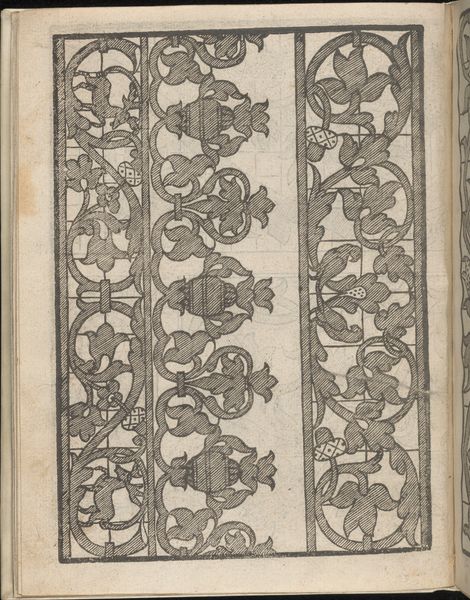 This is page 24 recto from "Ein new getruckt model Büchli," a woodcut created by Johann Schönsperger the Younger around the early 16th century. The print presents us with a striking contrast between organic and geometric forms, immediately drawing the eye. Notice the intricate floral pattern, flowing with naturalistic curves, juxtaposed against the rigid vertical lines and the serpentine band. This interplay isn't merely decorative; it creates a dynamic tension. The artist uses the visual language of his time to explore ideas around order and nature, maybe even chaos. The composition invites semiotic interpretation; each element functions as a sign. What do these forms communicate about the relationship between the natural world and human design? Does the artist reinforce or challenge the prevailing Renaissance values? This page, through its deliberate arrangement of form, serves as a site for ongoing interpretation.