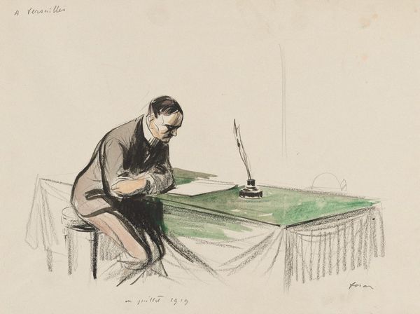 Jean-Louis Forain made this drawing, *A Versailles juillet 1919 II*, with what looks like charcoal or maybe conté crayon. The approach is immediate, gestural, and raw, like the process is about capturing a feeling more than depicting something perfectly. The texture is rough and scratchy, not blended. The lines build up to create the shadows, especially in the figure’s clothes and face, which adds a real weight. Look at how the strokes define the angle of the chair, the sharp edge of the table. Then, the way that little feather sticks out from the inkwell is like a punchline. It’s a moment of lightness in an otherwise heavy scene. It reminds me of some of Daumier’s courtroom sketches, capturing those tense moments. It’s like Forain is less interested in the facts and more interested in the mood, the psychological space, of a moment in time.