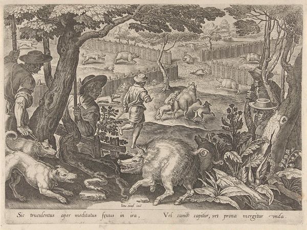 Editor: Here we have Jan Collaert's "Deer Hunt with Dogs," an engraving from after 1596. It's incredibly detailed! There's a sense of frenzied energy to the entire scene with all the animals in motion. What strikes you about the formal elements of this print? Curator: Formally, the most striking aspect is Collaert's use of line. Notice the density and directionality, carefully modulating light and shadow, and guiding our eyes through the convoluted space. Consider the stark contrast between the delicate hatching in the sky and the robust, almost sculptural lines defining the animals' musculature. It creates a captivating tension. Editor: I hadn’t really considered the lines independently. Do you think the contrast adds to the feeling of chaos? Curator: Precisely. The strategic deployment of linear density doesn’t merely depict chaos, but evokes it. Consider the composition as a whole: the dynamic diagonals formed by the fleeing deer and pursuing dogs. Are these lines not indicative of tension and urgency? Editor: That makes sense. I am starting to appreciate how the artist uses fairly simple lines to create a real sense of movement, like an action scene. What are your thoughts on Collaert’s choice of engraving for a dynamic composition? Curator: Engraving, with its capacity for intricate detail and sharp contrast, allows for a precision that other methods might not afford. The artist’s calculated cuts serve to escalate the drama by meticulously defining the interplay of light and form, giving life and substance to a somewhat fantastic creation. Editor: It's fascinating to think about how each line contributes to the overall impact. Thank you for showing me how to really analyze an engraving. Curator: Indeed. By recognizing such formal strategies, we move past a superficial view and commence to apprehend the profundity of the artist’s aesthetic pronouncement.