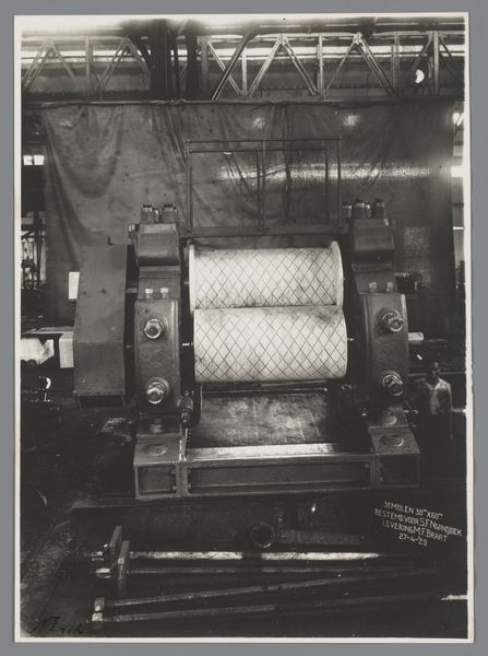 Curator: What a captivating image. This is Robert Frank's "Factory machine--Design," a photograph taken around 1941. It's a powerful example of his early work, focusing on industrial scenes. What’s your take as you first encounter this, editor? Editor: Stark and surprisingly graceful, if that makes any sense. It’s got this regimented order of mechanical elements, yet the whole feels strangely delicate. All the bright cylinders reaching into the shadowy space evoke something beyond pure machinery. It's beautiful, but also has the cold austerity of progress at that time. Curator: Absolutely, Robert Frank's choice to work in monochrome accentuates those contrasts. The photograph transforms the factory machine into almost an altar. The precise, repeated forms take on a symbolic quality— suggesting industry’s capacity for both creation and uniformity. Notice the light glinting off the metallic surfaces? Editor: I do. That light... it feels like a benediction in the age of mechanical reproduction, almost like a halo that gives dimension to each piece. I find myself drawn to the lone threads coming down. They contrast that strong industrial backbone to a fragile connection with organic matter—perhaps a life support or thread of fate for this whole industrial age? Curator: What an intriguing read! And thinking about the threads: each one distinct, yet feeding a larger, collective purpose. Considering Frank's later shift towards documenting the individual within American society, perhaps this photograph hints at his emerging perspective – capturing the dance between mass production and personal experience. Editor: Maybe this design itself is a cultural artifact, mirroring society’s values in steel and motion. Like the cogs of any era: always producing a different reflection, according to what is asked of it. One thread or a thousand… and still we end up asking how things connect, don’t we? Curator: Wonderfully put. It makes me consider the photograph not merely as a still-life of industrial equipment but rather a meditation on the systems that define us. Frank's work always leads you to contemplate deeper themes and, hopefully, to discover fresh perspectives. Editor: A design for thought, wouldn't you say? One where cold efficiency and ethereal presence coexist—revealing an unseen facet within even the most mundane of machine realities.