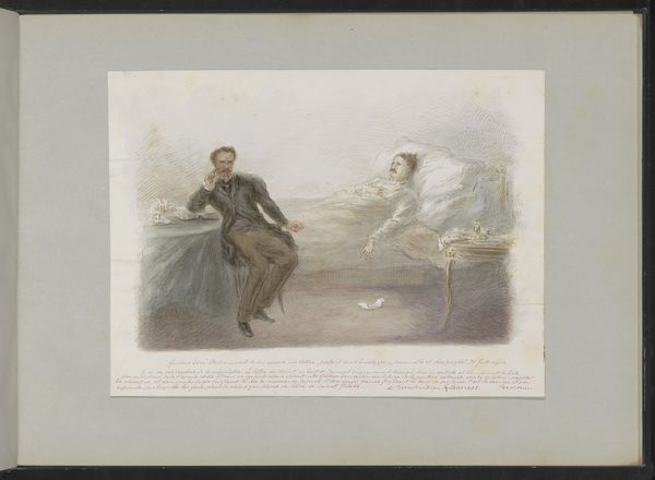 Curator: This 1896 print depicts a scene from Richard Wagner's opera, Das Rheingold. The print is a photographic reproduction, likely from an earlier painting illustrating the opera's narrative. It exemplifies how opera could extend its reach to a broader audience through reproduced imagery. What's your initial take? Editor: Dramatic! The contrast between the dark, anguished figure in the foreground and the ethereal, light-drenched maidens is really striking. I’m immediately drawn to the raw emotion conveyed by that central figure and its interaction with the rest of the picture. Curator: Right. It highlights the socio-political dynamics inherent in Wagner's Ring cycle, right? We see a figure, hunched, strained under pressure, in contrast with an apparent group of "privileged" nymphs, floating freely above in their otherworld. This image circulated widely, influencing the popular reception and understanding of Wagnerian themes of power, desire, and mythological conflict within the contemporary social climate. Editor: Interesting, the industrial printing processes really impact how accessible and widespread these kinds of depictions are, right? It democratizes access but also commodifies the high culture of opera, doesn't it? There’s a sense of labor implicit in the man but obscured by light for the women. What was lost and what was gained? Curator: Exactly! The image transforms into a marketable commodity, a symbol of cultural capital consumed by the burgeoning middle class. By studying this artwork, we understand not only the artistic choices, but also the complex social networks and forces through which artistic expressions take hold. Editor: So, a simple scene, photographically reproduced, reveals layers of the political climate of Wagner's influence, all through material access. I can walk away with more awareness than expected. Curator: Precisely, and seeing art this way, it feels even more pertinent and contemporary to issues of production, accessibility, and social messaging.