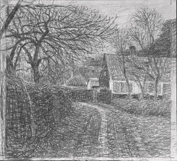 Curator: This is Frederick Landseer Maur Griggs' "The Causeway, Horsham" from the Harvard Art Museums. Editor: It strikes me as a scene steeped in tranquility—a quiet village street frozen in time. Curator: The etching medium itself is significant. Griggs meticulously crafted these plates, often revisiting medieval subjects, invoking a sense of historical continuity through traditional means. Editor: Precisely. The church spire dominates the composition, an age-old symbol of faith and community, anchoring the scene. The row of trees on the left serve as symbolic guards leading to the spiritual center. Curator: And we must consider the labor involved, the time etched away in representing this view, transforming materials into a collectible scene. Editor: Perhaps the artist was trying to capture something eternal in the everyday, finding sacredness in simple village life. Curator: Interesting perspectives. Editor: Indeed, materiality and meaning intertwine.