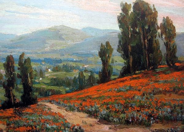 Editor: We're looking at "In the Botanical Garden," a 1951 watercolor and impasto painting by Martiros Sarian. It’s full of color, and there seems to be a nice layering effect using thick paint that creates so much depth and visual interest. I wonder, what is your read on it? Curator: The composition relies on distinct layers. Note how Sarian organizes space—the vibrant foreground, predominantly defined by red, transitions to the verdant middle ground, culminating in the muted backdrop of the hills. The eye is guided not through traditional linear perspective, but by a strategic arrangement of color planes. Editor: It feels very different from classical landscapes, right? More about blocks of color? Curator: Precisely. Consider the use of impasto. The tactile quality transforms the materiality of the paint. Observe how light interacts with these built-up surfaces. The vibrant pigments catch and reflect light in a way that enhances the dynamism and movement. How do you perceive this use of layering and impasto affecting your viewing? Editor: I think that, given the bright color palette, the painting is joyous, maybe even celebratory of life itself. The painting captures light in a way that evokes emotion more so than a photorealistic portrayal. Thank you! Curator: An astute observation! The painting provides insight into how an artist manipulates structure and color for expressive and formal effect. The use of non-naturalistic color generates affect, highlighting an intentional emphasis on form and emotion rather than descriptive accuracy.