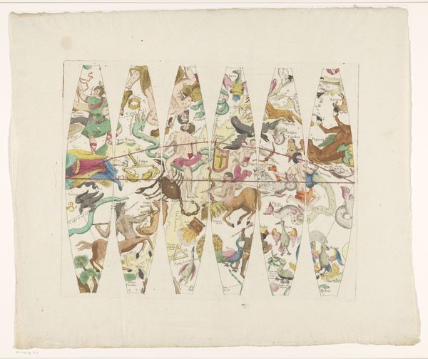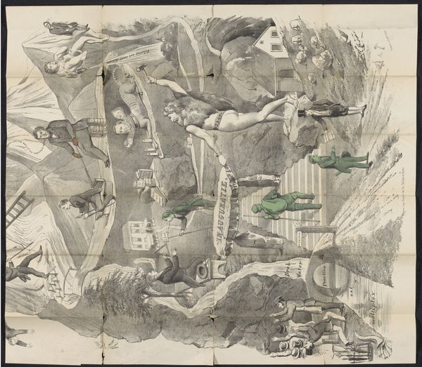 Kobayashi Eitaku created this small woodblock print, Momotaro, now held in the Rijksmuseum. The composition is complex, almost disorienting, with figures tumbling across the page and a high horizon line that flattens the pictorial space. Eitaku’s delicate line work and muted colors create a dreamlike quality. The scene depicts the Japanese folk hero Momotaro, or Peach Boy, known for his strength and courage. Yet, instead of a straightforward heroic narrative, Eitaku presents a scene of chaos and disarray. This destabilization might reflect the artist's interest in challenging traditional representations and exploring alternative perspectives within the Japanese artistic landscape. The use of oblique angles and dynamic arrangement destabilizes the conventional viewing experience. It invites us to question fixed interpretations and consider the multifaceted nature of cultural narratives. The print serves not just as a depiction but as an active site for the production of meaning.