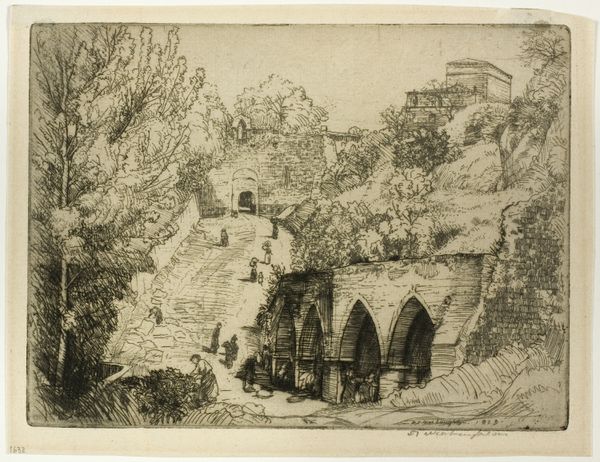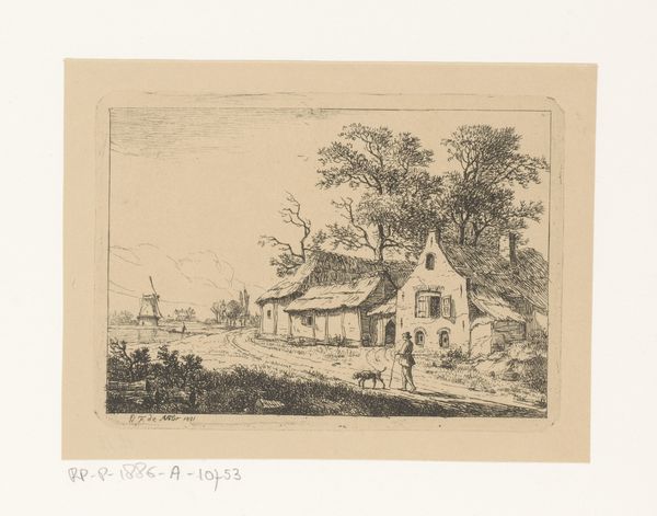 Editor: Here we have Anthonie van den Bos's "Vrouw met een mand voor een huis te Staphorst," created sometime between 1773 and 1838, an etching now at the Rijksmuseum. It feels so still, like a snapshot of a very specific place and time. What can you tell me about it? Curator: This image offers a window into the representation of rural life and gender roles in the Netherlands during that period. How does the depiction of the woman—her posture, her placement relative to the house—speak to the societal expectations placed upon women in agrarian communities? Editor: She seems so small next to the house, almost blending in. Is it portraying her as part of the scenery? Curator: Perhaps. Consider the power dynamics at play. The house looms large, suggesting permanence and stability, traditionally associated with male authority and ownership. The woman, with her basket, is mobile, suggesting her role in sustaining the household economy. But it's essential to consider that depictions like these, while seemingly straightforward, were often filtered through the lens of bourgeois ideals and romanticized notions of rural life. How might that romanticization obscure the realities of women's labor? Editor: So it might be glossing over the hardships, focusing instead on a neat and tidy image? Curator: Precisely. And who is the intended audience for such an image? How does that influence the message being conveyed? The work prompts us to investigate whose stories are amplified and whose are silenced through art. Editor: It's like it's inviting us to question what we're really seeing, and what's being left out. Curator: Absolutely, this work presents an opportunity to think critically about representation and power within seemingly bucolic scenes. Editor: Thanks, that is eye-opening. I'm glad I understand better now how to approach similar artworks from a different point of view.