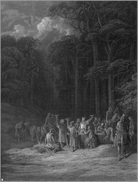 Editor: We are looking at “David and Jonathan” by Gustave Doré, an engraving. It depicts two figures in what looks like a farewell scene in a dense forest. There's a definite somber mood evoked by the strong contrast of light and shadow. How do you read this composition? Curator: Note how the dense, almost claustrophobic forest frames the figures. The light is not merely illustrative but structurally important, isolating David and Jonathan, drawing the viewer's eye to their interaction, specifically, and the reflective surface of the water at their feet. What is suggested by this interplay of darkness and light in relation to the figures' poses? Editor: Well, their faces are cast in shadow, and one appears to be comforting the other, as the figures huddle. I wonder, how would you characterize the lines themselves? Curator: The lines are incredibly precise and detailed, typical of Doré's engraving style. They are not merely descriptive but create texture and depth, contributing to the emotional intensity. The direction of the lines, the varying density, serves to amplify a sense of unease, would you agree? How does the surface of the water reflect the scene as a whole? Editor: The ripples blur the figures' reflections. The image makes one feel very small in such a wild location. It seems the details in the illustration adds tension between the two figures while also revealing vulnerability and emotional exposure in a desolate scene. Curator: Precisely. Through line, light, and composition, Doré achieves an unparalleled degree of emotive expressiveness within a stark visual economy, one defined through visual means only. Editor: I never considered the lines to have such an impact and such purpose. Thanks for walking me through your interpretation.