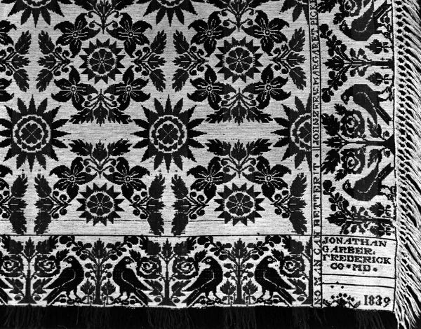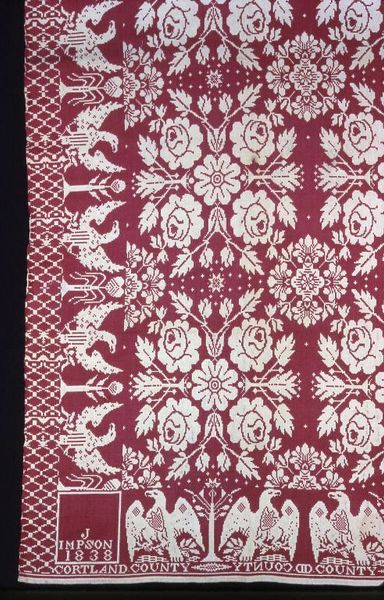 Editor: Here we have Jacob Impson's woven "Coverlet" from 1842, now residing here at the Art Institute of Chicago. The textile patterns create this overall sense of… order. Stately even? What do you see when you look at this piece? Curator: Order is a great word. But within that seemingly rigid framework, I see echoes of life, echoes of personal story and history woven right into the threads. See how the geometric and floral motifs intertwine? The almost hypnotic repetition draws you in. It speaks to the rhythms of life on the frontier and in Cortland County, of its time, but the maker also had very specific ideas about this weaving. Notice the Eagles flanking the central design, symbols of a fledgling American experiment? Editor: Right, the Eagles, very patriotic. The repetition…it almost feels comforting in a way, the predictability of it all. Curator: Comforting, yes! And crucial. The coverlet offered physical warmth, of course. But it also acted as a visual text, layered with cultural and personal meanings. Something that must have been deeply cherished, especially given the sheer effort of weaving such a piece, by hand, in 1842! What are the messages that the artist wove into it, do you think? Editor: Maybe messages about family, home, security? That's beautiful to consider! I'd initially overlooked that, focusing purely on the repeating geometric structure, but your points make it far more personal. Curator: Exactly! A piece of woven code, a personal and cultural history speaking silently across generations. A quiet conversation between then and now.