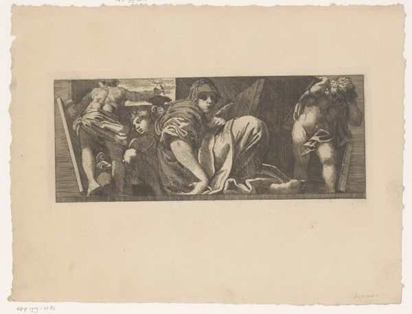 Editor: This is "Aeneas vertelt Dido over zijn lotgevallen" by Gerard de Lairesse, made in 1668. It's a drawing, ink and engraving on paper, currently held at the Rijksmuseum. It's a highly detailed pen sketch, isn't it? It's hard to believe that such textures and contrasts can be rendered by just one type of material! What stands out to you the most about this piece? Curator: It’s fascinating to consider Lairesse's choice of engraving for this subject. He depicts a legendary scene of power, love and war, a high-art subject usually executed via painting. By rendering it as an engraving, it invites a material reading of accessibility, both through the relatively lower cost of production and reproduction. It challenges the traditional notion of luxury surrounding oil on canvas, bringing stories from high society to other members of society via reproducible engraving. How does it alter your understanding to see this scene in such an approachable format? Editor: It does make the epic more… democratic, in a way. So the *materiality* of engraving reframes what kind of audience would consume this subject matter? It's quite striking to consider, especially since we know that Baroque art and engravings often promoted high society taste, nobility, and the wealthy! Curator: Precisely. The material here disrupts conventional class boundaries. Lairesse presents this classic narrative but through the material means of an engraving, inviting critical assessment of the culture that consumes it, no? Are we looking at an artist democratizing myth, or simply adapting to economic realities of print production? What do you think? Editor: I guess, that even through choosing an affordable artistic product he can still expose more people to his art? Thinking about the impact and reach the material brings definitely changes my views a lot. Curator: Indeed. The piece becomes as much about *who* gets to see the art, as the scene depicted *in* the art. Something to keep in mind whenever approaching art from this period!