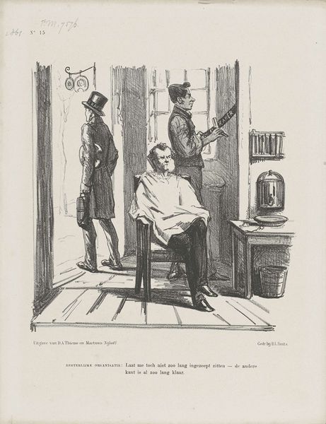 Editor: This ink drawing, titled "Spotprent op directeur van het Kabinet des Konings De Kock, 1860," made by Johan Michaël Schmidt Crans in 1860, feels… strange. I'm struck by the chef-like figure towering over formally dressed men. What's going on here? What do you see in this piece? Curator: It’s a caricature, right? Consider the title, implying a lampooning of Director De Kock. Notice the date: 1860. Caricatures were powerful social and political tools then, circulated widely. Look at the exaggerated features, the subservient poses of the men. Who were they and what are their intentions? Editor: Good point! So, the ‘chef’ is likely De Kock, and these other figures represent… individuals under his power? Is the cooking imagery symbolic? Curator: Precisely! Cooking implies preparation, transformation, and perhaps manipulation. Think about how the kitchen, as a domestic space, is here transposed onto the realm of political power. What’s being "cooked up" politically? The Latin phrase adds another layer. Editor: "Remember, man, that you are dust, and to dust you shall return," right? That's a pretty stark contrast to the pomp of these men's attire. Almost like a *memento mori*, but for political power. Curator: Exactly. This drawing doesn’t merely satirize De Kock, but the transient nature of power itself. How it's constructed and maintained. What institutions prop up these individuals. Consider where something like this was circulated; who would it be targeting? Editor: So it’s more than just a funny drawing; it’s a commentary on the structures of authority within the royal cabinet. It makes me consider art's capacity to undermine authority in popular visual culture. Curator: Absolutely! It offers us a window into how visual imagery shaped public opinion and questioned those in power during this era.