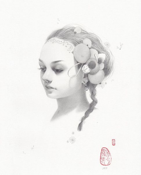 Editor: This is "Hollow Pollen," a 2016 pencil drawing by Soey Milk. It’s quite delicate, with incredibly fine detail. I'm really drawn to the subject’s serene expression. What kind of deeper meanings can you pull from this work? Curator: The image certainly has a compelling tranquility. The flowers, particularly peonies, which look like what’s adorning her headwear, speak volumes. Historically, they’re associated with wealth, honor, and even royalty in East Asian cultures, specifically Chinese culture. But, the “hollow” in the title contradicts that opulence. What does that suggest to you? Editor: It's like the beauty is just a surface thing, and the title hints at something missing beneath? The adornments contrast with the very vulnerable, closed-eye posture of the person depicted... almost a melancholy. Curator: Precisely. Consider the use of the pencil. Its inherent simplicity lends itself to capturing raw emotion and intimacy. And note her lowered gaze: this may suggest introspection, but from another perspective, social evasion and perhaps something hidden. What historical or cultural connotations does such deliberate "concealment" conjure for you? Editor: I hadn't thought of it that way... perhaps it speaks to a tension between traditional expectations of beauty and inner turmoil. Almost a protection? Curator: Exactly. These contrasting symbols and artistic choices add layers to the reading. What first appeared beautiful becomes infused with cultural nuance, creating dialogue with tradition, psychological state, and symbolic weight. Editor: I see how the artist is using a really specific visual language, especially with familiar symbolic content. Curator: The beauty of iconography! We both found ways this deceptively simple portrait uses imagery to engage with centuries of art, culture, and feeling.