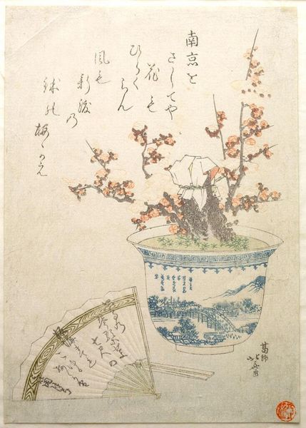 Curator: This delicate woodblock print, held at the Harvard Art Museums, is titled "Plum Blossoms Over Stream," created by Kubo Shunman, who lived from 1757 to 1820. Editor: It feels so ephemeral, almost like a memory fading into the paper. The vertical composition with the plum blossoms against the water creates a very serene atmosphere. Curator: Plum blossoms carry such weight in East Asian art, often representing perseverance and hope, blooming even in the harshest winters. The poem inscribed adds another layer to this emotional depth. Editor: And water, of course, is also rich with symbolism – transformation, renewal. Here, the stream is rendered as these flat, stylized shapes. How do you feel that technique changes our understanding? Curator: The flatness emphasizes the continuity of cultural memory. These aren't simply observed plums and water, but rather, representations that echo through artistic history. Editor: It's fascinating how even the dimensions of the print itself, a mere 12 by 9 centimeters, contribute to that intimate feeling. Like holding a private moment in your hand. Curator: Absolutely. It reminds us that art history is always personal, filtered through our own experiences and interpretations. Editor: It certainly invites a deeper contemplation of the transience of beauty and the enduring power of art.