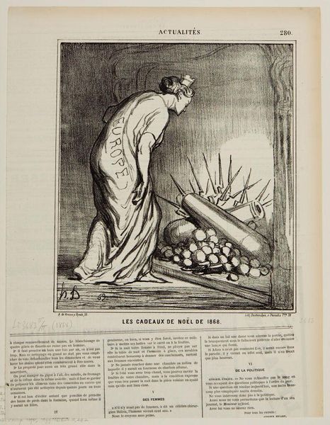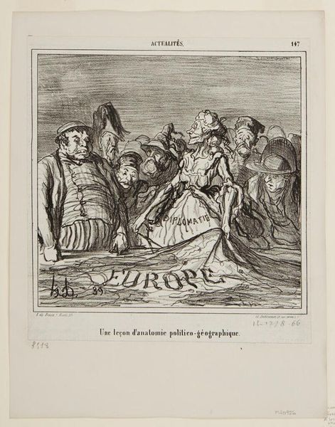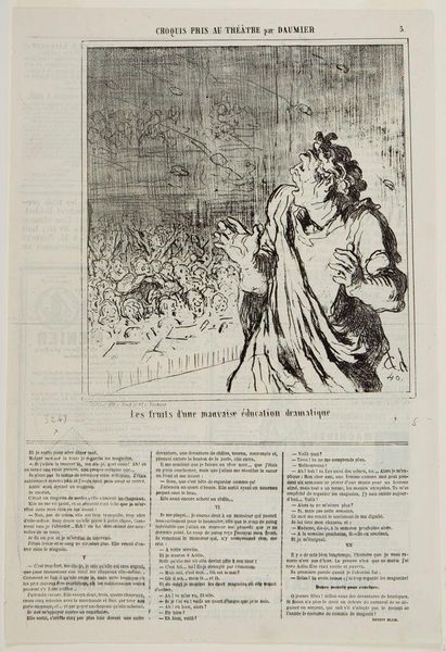 Curator: Daumier's lithograph, "The Woman with the Beard," captures a moment of high drama, a theatrical scene brimming with social commentary. Editor: It strikes me immediately with its bold contrast. The stark, almost grotesque figures against the densely hatched background creates a powerful, unsettling mood. Curator: Indeed. Daumier employs lithography to reproduce the energy of the stage. This printmaking technique allows for nuanced tonal ranges, crucial to conveying the emotional intensity and the social critique inherent in his work. Editor: Thinking about the material and the method, lithography afforded wider circulation, making Daumier’s social critiques accessible to a broad audience, challenging conventional distinctions between art and mass media. Curator: Precisely. He uses the accessible medium to bring the spectacle to the everyday, turning the stage into a mirror reflecting society’s absurdities. Editor: So, in examining the composition, Daumier doesn't just present a scene. He implicates the viewer, forcing us to confront these uncomfortable truths about gender and class. Curator: Agreed. Daumier's lithographs offer insights into the social dynamics of the 19th century and also demonstrate how printmaking could shape the cultural discourse of its time.
