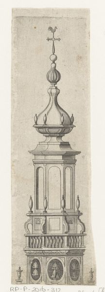 Curator: Looking at this drawing, the stark lines and formal composition feel surprisingly…restrained. Editor: Yes, it’s "Indische Säule und Architrav", or Indian Column and Architrave. Gustav Rügemer rendered it in ink; its Neoclassical style pulls in elements of what was perceived as “Indian” architecture for 19th century European viewers. It lives here in the Städel Museum’s collection. Curator: That’s so interesting! You see, I’m immediately drawn to the top—those rounded forms practically vibrate. And then my eyes fall down toward the center to find this kind of curious theatrical mask, complete with what look like wings or ribbons flowing outward... there's tension between gravity and theatrical flourish. Editor: Absolutely. Those "wings" might evoke garlands, or possibly stylized foliage mimicking forms from the natural world while maintaining classical symmetry. The mask or Gorgon-like face is more than just ornamental— it acts as an apotropaic symbol warding off evil. Columns weren’t *just* structural elements in ancient times; they carried profound symbolic weight. They visually enacted protection for important buildings and the rituals performed there. Curator: The layers here are amazing! Because, even if subconscious, aren’t we *all* still seeking that sense of grounding *and* protection today? Architecture always tries to pull the infinite, ethereal, conceptual, cosmic…down into our mundane reality. Does that even make sense? Editor: Completely! The column literally shores up the physical realm; it gives our ideas a structure, allowing us to contemplate abstract ideas more concretely. Rügemer seems interested in how classical form blends—or clashes—with cultural interpretation. The image embodies cross-cultural dialogue while presenting it with absolute confidence and restraint, as though one's culture could define someone else's. Curator: That feels like something people have yet to unravel! I see endless inspiration here! It feels incredibly relevant even now. Editor: Me too, looking at how such loaded cultural ideas from history can show up and inspire new dialogues…it's incredibly fascinating.