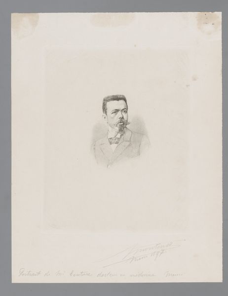 Curator: Here we have Georges Montenez's 1896 pencil drawing, "Portret van een onbekende man, mogelijk Couture"—that translates to "Portrait of an unknown man, possibly Couture." Editor: There’s a certain melancholy hanging about him, don’t you think? The sketch is faint, almost ghost-like, especially against the aged paper. The detail in his face contrasts starkly with the unfinished body. Curator: That starkness highlights the conventions of late 19th-century portraiture—emphasis on capturing individual likeness but with a clear institutional bent. Artists like Montenez were wrestling with the academic standards expected by the Salon system while absorbing Impressionist aesthetics. The title itself points to this—speculating that the subject might be Couture, a renowned academic painter, speaks volumes. Editor: Right, Couture who pushed against realism. I’m fascinated by the materiality of the drawing, the artist's choice of pencil allowing for such subtle gradations and delicate lines. You can almost feel the texture of the paper, the pressure of Montenez’s hand as he built up the forms. Curator: Pencil offered accessibility and a certain intimacy, a shift away from the grand pronouncements of oil paint. Sketching gained prominence as capturing fleeting moments in a rapidly changing world. And it fed into visual culture at large via inexpensive methods of printmaking at that time. Editor: You see the seeds of reproduction and distribution in the material itself. It speaks of utility—of artistic study but also of democratizing portraiture. How might this circulate beyond an elite art world? Curator: Precisely. It blurs the lines between fine art study and mass-producible imagery. It anticipates shifts in artistic patronage, as well. This "unknown man" hints at the era's increasing democratization, perhaps gesturing toward capturing subjects outside established networks of power. Editor: Ultimately, the drawing acts like a residue of the past: from artist’s hand and paper. It provides so many rich and complex thoughts, connecting labour to process in a new and exciting way. Curator: Indeed. This sketch encourages us to look beyond surface appearances and delve into the socio-cultural forces that shaped its creation and the era.