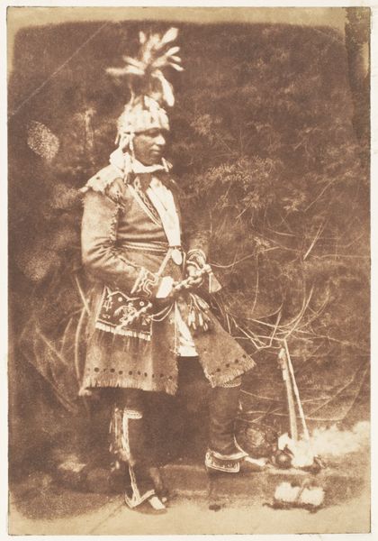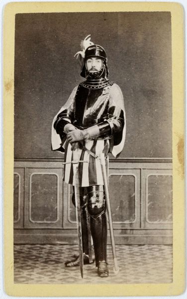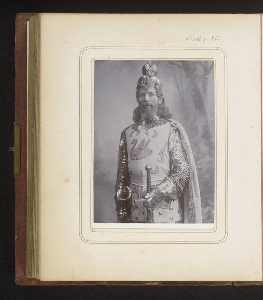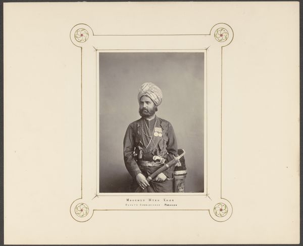 Editor: This albumen print, "Portret van Ranbir Singh, Maharadja van Jammu en Kashmir," was taken by John Burke between 1880 and 1890. The detail is incredible! The Maharaja’s clothing and adornments, the patterned carpet… I'm struck by how posed and constructed the image feels. What do you see in this piece, considering the materials used and the time it was made? Curator: I'm immediately drawn to the process of creating an albumen print in the late 19th century. Think about the layers of labor involved: from preparing the glass plate negative and coating the paper with egg whites and silver nitrate, to the exposure time and careful development. It’s a highly specialized and controlled industrial process. Consider that the luxurious appearance reinforces the power and authority that resides outside the image in access to material, wealth and specialized, often outsourced or colonial, labor. Editor: So, it's less about capturing a realistic likeness and more about demonstrating power and access to resources? Curator: Precisely! The very materiality of the photograph signifies wealth and imperial reach. Who benefits from creating and disseminating such images, and who is rendered invisible in the process? What were the social relations underpinning the aesthetic decisions involved? Note that this particular style is sometimes referred to as Orientalism; a staged encounter of an idealized otherness. It exoticizes by use of light, texture, and framing to convey romanticized stories. Editor: It is eye opening to consider photography in terms of its labor and embedded systems. Now the Maharaja seems almost like a prop! Curator: Exactly. By focusing on the material conditions and historical context, we can move beyond the surface appearance and uncover the complex power dynamics at play in the creation and consumption of this image. I find the materiality illuminating as to wealth and authority as primary drivers, as opposed to the more ethereal concept of “beauty”.