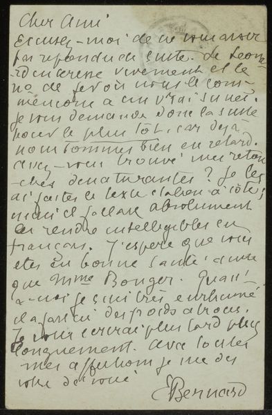 Editor: This is "Briefkaart aan Andries Bonger," a drawing in ink on paper by Emile Bernard, made before 1908. It looks like a postcard covered in very neat handwriting. The overall impression is intimate, like peeking into someone’s personal correspondence. What catches your eye about this little piece? Curator: It’s like holding a captured moment, isn't it? The ink bleeds a little into the paper, and the script almost becomes an abstract pattern in itself. Bernard seems to be thanking Andries Bonger for a card, possibly for a birthday, but also sets up his journey to Holland! To me, these types of personal postcards give insights to daily lives during those periods. I find it intriguing, imagining the circumstances in which this was penned, what do you make of its visual weight on such small form? Editor: That's fascinating, it didn't strike me as particularly emotional at first glance, more of a transactional gesture than one laden with feeling. Curator: Perhaps, though consider the act itself. Handwriting a letter versus sending a telegram for instance. Doesn't the gesture speak louder sometimes than words? Do you think the intended audience, Bonger, was just a friendly acquaintance? Editor: That’s true. I hadn't considered the intimacy of the handwritten form. I suppose there’s an element of performance, even vulnerability, in laying out your thoughts so carefully on paper, in contrast to digital communication nowadays. It gives me something new to think about. Thanks! Curator: Indeed! It is about looking at an artist's work with context. Consider this and it could create new layers of interpretations. It gives so much texture, doesn't it? Thanks for this insight too!