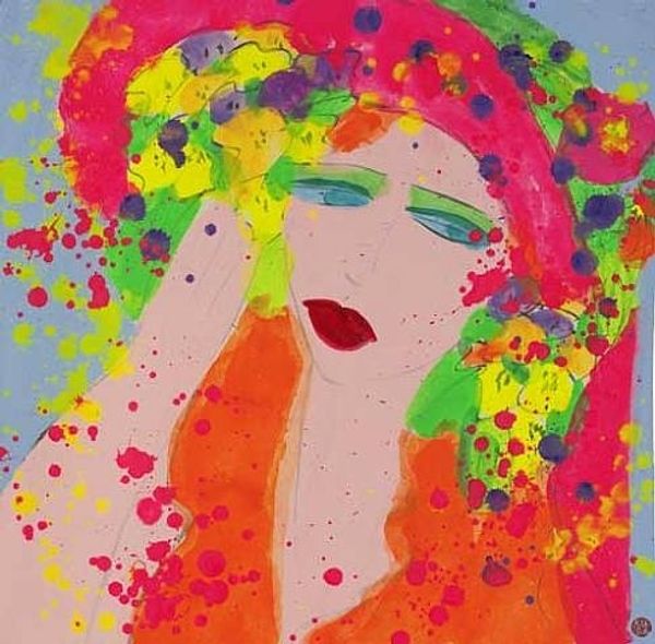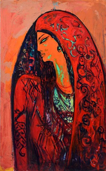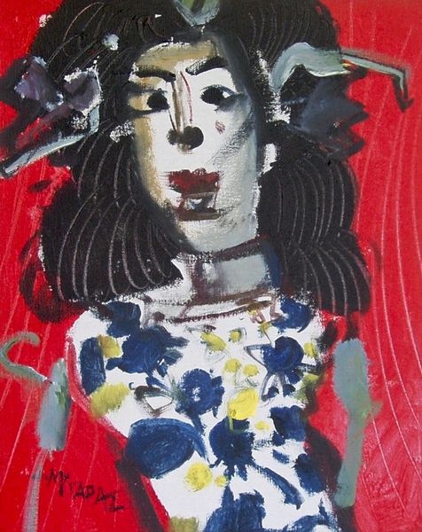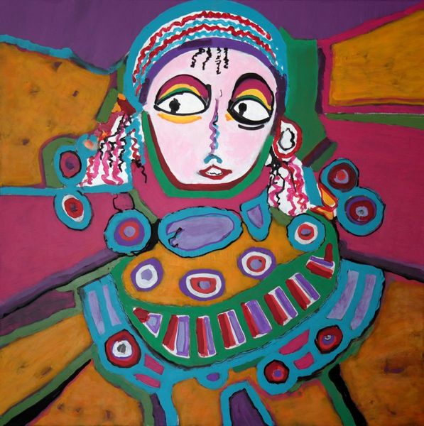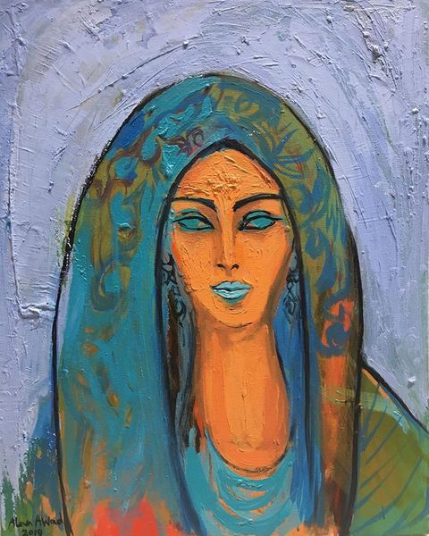 Editor: We’re looking at Alaa Awad’s "Portrait" from 2018, made with acrylic paint. I’m really struck by the bold colors—the almost shocking contrast of the blue figure against that fiery red and orange background. What symbols jump out at you? Curator: The color itself becomes a powerful symbol here. Blue, often associated with serenity and spirituality, is used for the figure, immediately creating a sense of otherworldliness. What does this evoke in you? Editor: It does feel like she’s not quite present, almost like an icon…distant but captivating. Curator: Exactly! And then you have the red and orange – traditionally colors of passion, energy, even danger. Placed behind this serene blue figure, a fascinating tension emerges. Think about religious iconography; how often are figures framed by a halo of gold or light? The artist seems to be playing with that expectation, using these intensely vibrant hues to create a similar sense of importance or spiritual energy, perhaps even disruption. Notice also the swirling patterns in her head covering, that evokes a sense of dynamism, life force perhaps. Editor: I hadn’t really considered how the background colors were doing so much work. I was focused on the figure. Curator: It’s easy to be drawn to the face, especially in a portrait! But consider how these Fauvist and Expressionistic choices work together to express deeper emotional truths about the subject, it's a powerful language in itself. It speaks to our history as viewers and our psychological understanding of the world. Editor: This really makes me think about how colors and even patterns become loaded with so much cultural significance, without us even realizing it. Thanks for pointing all of this out! Curator: My pleasure! It is a striking example of how visual symbols create cultural memory.