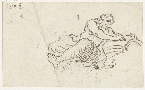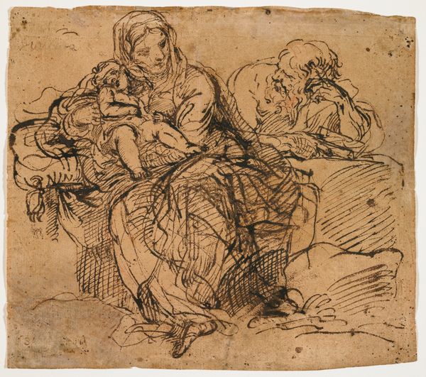 Curator: This is Hubert François Gravelot's "Border for Engraved Portrait by Houbraken: Thomas Howard, Duke of Norfolk," held here at the Tate. It's a preparatory drawing, it seems. Editor: The sepia wash gives it an immediacy; like we're catching a glimpse of the artist's working process. I'm struck by the rather odd juxtaposition of the chubby child with what looks like a deceased figure. Curator: That child, almost a putto, is tugging on the drapery, obscuring the Duke's face. It speaks to ideas of mortality, the veil between worlds, and the transience of earthly power. Editor: I'm more interested in the material reality: the textures Gravelot creates with simple washes and lines. The rapid execution suggests a working drawing, made to explore various concepts of the border. Curator: The symbols within those borders hold cultural weight, reflecting how the Duke was meant to be memorialized. Consider the cherubic figure, a common symbol of innocence, juxtaposed with aristocratic stoicism. Editor: It's fascinating how quickly Gravelot conveys such layered meanings with such limited materials. The paper itself becomes a vital part of the image. Curator: Absolutely. The symbolism gives depth, doesn't it? Editor: Indeed, it all comes together to tell a story of its own.