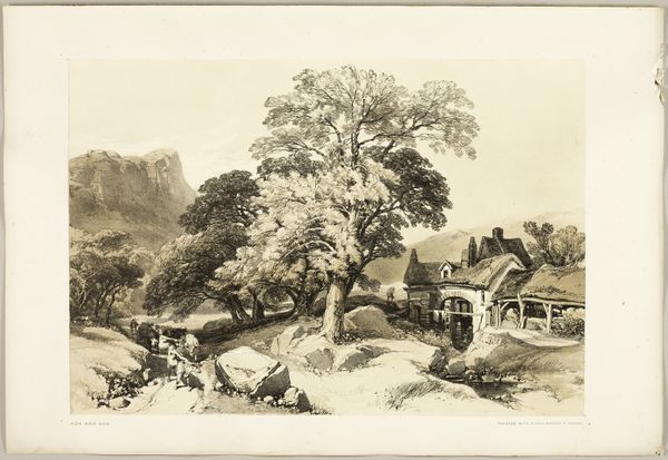 Curator: Here we have Edward Lear’s "Collepardo," created in 1841. It’s a lithograph, employing ink on paper, currently residing here at The Art Institute of Chicago. Editor: Oh, my, what a view! It has a hauntingly serene feeling, like the edge of the world. The figures in the foreground seem so small against that grand panorama. I'm immediately drawn to that precipice. Do you think anyone has ever tumbled over it? Curator: The interplay of light and shadow is particularly compelling. Note how Lear uses subtle gradations in ink to delineate form and space, establishing a clear hierarchy of visual elements, thereby guiding the eye to the distant, illuminated city. Editor: Absolutely. It feels like he's both documenting and romanticizing. It’s almost…theatrical, like a backdrop for a historical drama. Though the sepia tones contribute to an overwhelming melancholy for me; all this dust! I suppose this effect may be unintentional, however, merely due to the nature of Lear's choice of inks? Curator: Not at all! We can consider the conventions of Orientalism here. These visual cues provided an aura of authenticity to his European audience. Indeed, Lear subtly crafted this sense of exoticism by meticulously rendering topographical details whilst, simultaneously, imbuing the work with emotive qualities. It's quite cunning, wouldn't you agree? Editor: In a manipulative way, perhaps. Even though, if one disregards that problematic aspect, the composition draws me in! A feeling of timelessness permeates every canyon crevice and crumbling stone. Curator: Precisely. He achieves that timelessness, that pervasive historical feeling, through calculated tonal variation. This visual technique invites meditation on time, history, and landscape as immutable constructs. It is also significant that Lear would employ these formal techniques toward drawings for his *Illustrated Excursions in Italy*—he's essentially performing landscape-as-performance in this series! Editor: Yes! All this dust really has me thinking: the drawing seems so fixed, and permanent, yet Lear implies everything—the figures, the cliff, the sun and the clouds—is slipping further away from our fingers with each passing day. So somber...and so clever. Curator: A stimulating thought indeed, about the fleeting nature of our very human moment. Thank you. Editor: My pleasure.