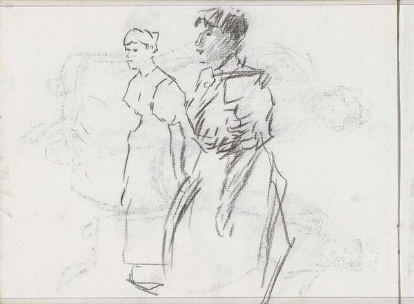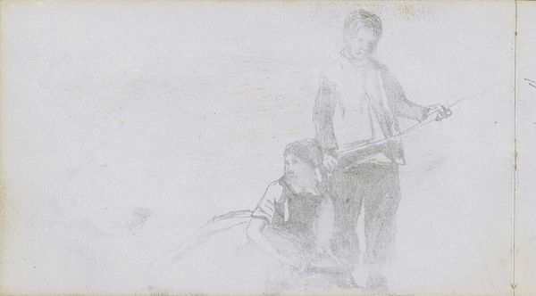 Editor: This drawing, "Meisje liggend naast een staande jongen," or "Girl lying next to a standing boy," created between 1834 and 1903 by Johan Hendrik Weissenbruch, is just a pencil sketch. I find it fascinating how such a simple medium can capture such a seemingly candid moment. What’s your take on it? Curator: What I see is a deliberate commentary on social class. Sketches like these offered artists a chance to explore the everyday lives of people outside of the traditionally painted elite. We see this interest in Realism blossoming at this time. Does the composition, especially the difference in posture between the figures, tell you anything about their relationship or social standing? Editor: Perhaps the standing boy, with what looks like a fishing rod, has a more active, possibly dominant, role than the girl who's sitting idly by. It's intriguing to consider the possible narrative within the sketch. How would this have been perceived in its time? Curator: It’s likely this would have been viewed through a lens of nascent social awareness. Genre scenes such as these allowed the public to contemplate societal dynamics. They presented idealized yet relatable characters that reflected or challenged prevalent societal values. Are they presented in a sympathetic light, or are we invited to make a judgement about the scene? Editor: I never considered art’s power to influence or document society like that. I guess that, in some ways, art imitates life, but life also shapes art! Curator: Precisely! This seemingly simple drawing then, becomes a powerful social document of its time. Examining the institutional frameworks surrounding art allows a far deeper comprehension.