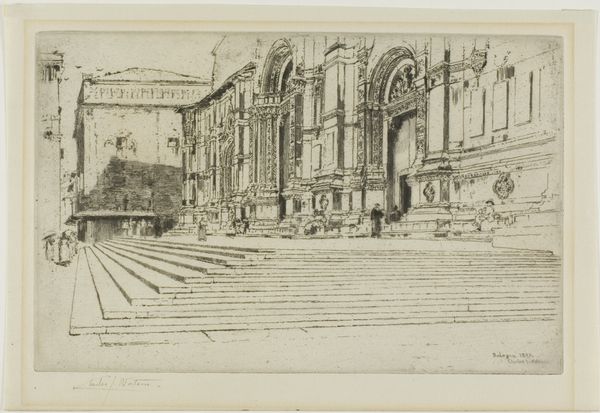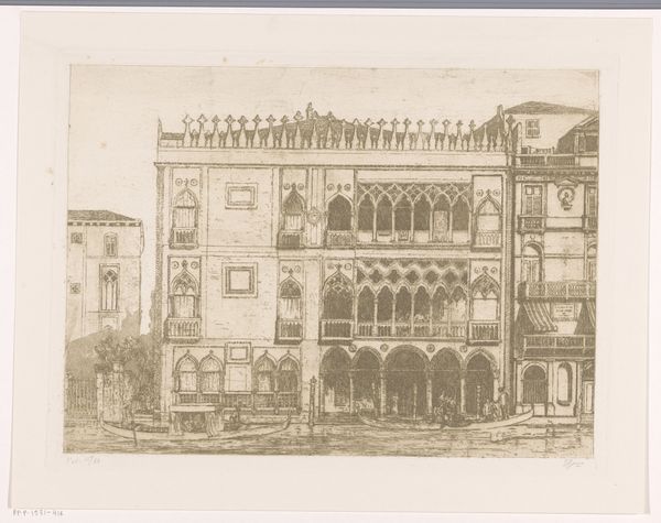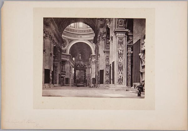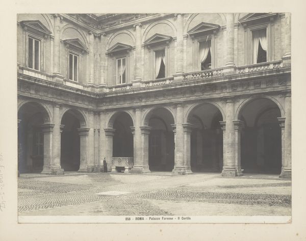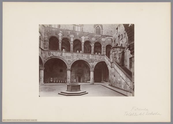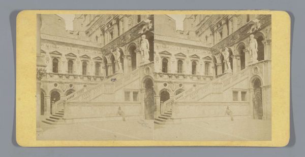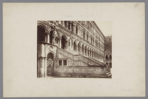Editor: Here we have Carlo Ponti's gelatin-silver print, "Scala dei Giganti op de binnenplaats van het Dogepaleis te Venetië, Italië," dating somewhere between 1852 and 1893. It's quite an imposing architectural shot. What strikes me is how solid and permanent it all looks, yet it’s captured through such a fragile medium. What do you make of it? Curator: The solidity is deceptive, isn’t it? As a photograph, a gelatin-silver print, its existence hinges on specific material conditions, a very particular process of labor. The Doge's Palace represents the historical and political power structures of Venice, power derived from its economic infrastructure and international trade networks. But consider what Ponti is doing: using the *new* technology of photography, itself a product of industrial and chemical advancements, to document the decaying architecture, the ossified social order, of old Venice. Editor: So the photograph isn’t just *of* something, it’s commenting on it through the materials and process itself. The tension between permanence and fragility that I perceived now seems much more deliberate. Curator: Precisely. And the seemingly objective lens is itself a product, consider how its development was funded and driven by early capitalist ventures! Think of the laborers in the darkroom, the mining of silver... what social relations do we find implicated in this image’s very existence? Editor: That shifts my perspective. It’s no longer just a picture of a grand staircase, but a record of industry, labor and commerce. Thank you, that's really fascinating. Curator: Indeed, seeing how the material conditions of artmaking reflect and shape our understanding of the world is crucial. It invites us to consider what other histories are literally embedded in the object itself.