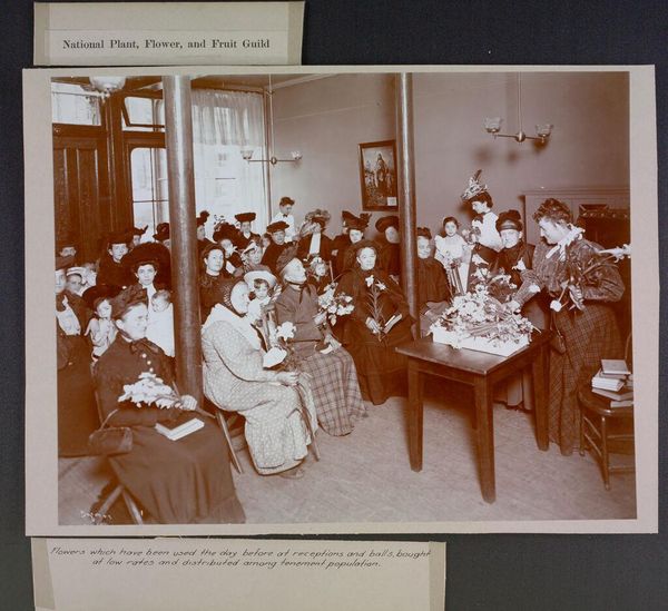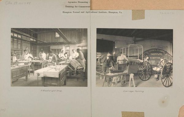 Editor: This is a photographic artwork titled "Races, Immigration" by J.H. Adams, portraying the United States Immigrant Station in New York City. The composition is divided into two scenes, creating an interesting juxtaposition. What can you tell me about the visual elements at play? Curator: The symmetry is striking, is it not? The composition is cleanly bisected, which directs our attention to the contrasting groups. Note the light and shadow. On one side, the figures await processing, bathed in light. On the other, a darker scene depicts the laborious task of registration. The arrangement directs the viewer's eye and prompts a comparison. Editor: It's fascinating how the artist uses light to emphasize different aspects of the immigrant experience. Thank you. Curator: Indeed. By examining the formal qualities, we gain a deeper understanding of the artist's intent. The structure allows for an eloquent commentary on the immigration process.