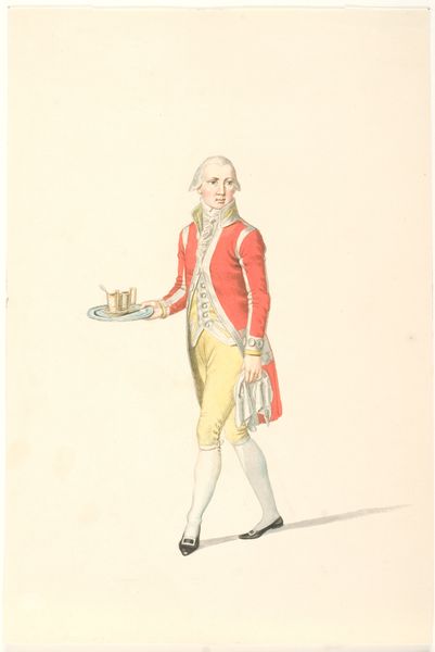 This is Kongelig dørvogter—Royal doorkeeper—a delicate drawing made by Johannes Senn. The colour palette here—predominantly pastel shades of red, yellow, and blue—evokes a sense of lightness. Notice the composition; the figure is positioned against a stark, almost clinical white backdrop, save for the geometric form of the doorway. Senn's precise draftsmanship imbues the doorkeeper with an air of authority, his posture rigid, his gaze unwavering. Yet, there's a curious tension at play. The doorkeeper's shadow, a muted echo of his form, introduces a destabilizing element. This image, meticulously rendered yet strangely devoid of context, invites us to question fixed meanings. Is Senn prompting us to consider the structures of power, the semiotics of uniform, and the very act of representation? The drawing, therefore, is a space for active interpretation, an invitation to explore the interplay between form and meaning.