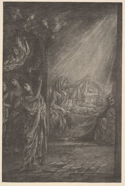 Federico Bencovich’s "Ecstasy of the Blessed Piero Gambacorti of Pisa," is a drawing that captures a dramatic spiritual moment. The monochromatic scheme enhances the dramatic effect, focusing our attention on the figures caught in an intense interplay of light and shadow. Notice how Bencovich uses line and form to build a composition that leads our eye upwards, from the earthly realm to the divine. The formal structure of the drawing is intriguing. Bencovich destabilizes traditional religious art through his dynamic composition, creating a sense of movement and emotional intensity. The figures are not statically posed but are caught in moments of passionate expression. Through the use of chiaroscuro, Bencovich constructs an ethereal space, suggesting a break from the conventional and engaging with new ways of representing spiritual experience. The drawing leaves us contemplating how Bencovich uses form to convey complex emotional and spiritual states, challenging viewers to engage with the artwork's deeper meanings. It invites ongoing interpretation.