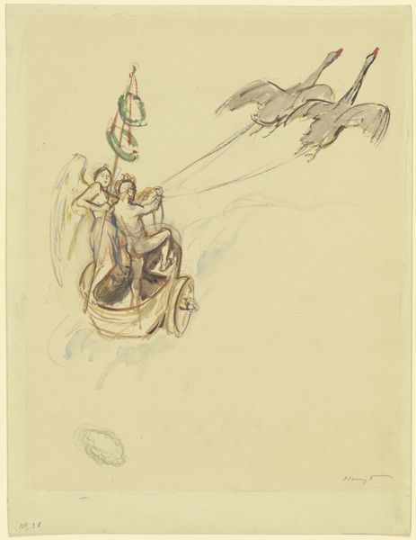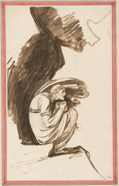 Editor: Here we have Pieter Verbruggen the Younger’s "Design for a sepulchral monument with an allegory of Time," dating roughly from 1686 to 1724. It's a drawing, and quite ghostly. What structural elements jump out to you? Curator: The dynamic opposition between the two figures, Time and what I interpret to be Mortality, establishes the foundational structure. Notice how Time, wielding the scythe, is oriented toward the figure below. Editor: Right, that immediately struck me. There’s such a contrast between Time's activity and the other figure's limp pose. What's the significance of their spatial arrangement? Curator: Consider the Baroque’s embrace of diagonals and implied movement. Verbruggen uses the placement of these figures to create a strong diagonal axis that disrupts any sense of static composition. Further, we have to acknowledge the material itself: chalk. How would you say that enhances the overall composition and meaning of the drawing? Editor: Good question. It feels like chalk gives a lightness, almost like a sketch, so that what is presented is not as grave or resolved as it would have been had it been in another material, like oil. It presents us with layers of representation, an allegory for transience using ephemeral lines. Curator: Precisely. The chalk lines are neither definitive nor prescriptive. They are permeable, mirroring, perhaps, the very nature of Time he is trying to present to us. Verbruggen also smartly uses cross-hatching. Do you think it adds another layer of meaning or just represents shading? Editor: Now that you point it out, it looks like it's intended to represent darkness, or a building shadow, but the cross-hatching also adds more graphic definition to both bodies, creating greater volume and a bit of dread. Curator: Agreed. It amplifies that dread as we begin to confront these allegories more deeply. It shows the careful consideration of every element to promote the theme of temporality. Editor: I definitely see that now. The interplay between figure placement and use of chalk enhances the emotional and conceptual resonance.