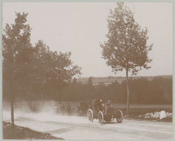 Editor: This photograph, “Autocoureur Jamin, deelnemer aan de Tour de France voor automobielen, op een landweg in Vitry-le-François,” taken around 1899 and held at the Rijksmuseum, depicts a car on a dirt road lined with trees. The sepia tone gives it a very nostalgic feel. What strikes me is how much slower and simpler this looks compared to modern racing! What do you see in it? Curator: It’s easy to romanticize the early days of motorsport, but your first reaction does touch upon something. The image serves as a valuable social document, capturing the dawn of the automotive age and its integration into the French landscape. The ‘Tour de France for automobiles’ was not just a sporting event; it was a public spectacle. We see the infrastructure of the early automobile industry, including roadways, technology, and the enthusiastic participants in what would become an influential cultural and economic force. How does this “integration” play out in your reading of the composition and style? Editor: Well, it feels like the car is placed *within* the landscape. The soft focus of Pictorialism emphasizes atmosphere rather than pure mechanics; it blends in. A modern shot might highlight the car's speed and separateness from nature. Curator: Precisely. The artistic choice of Pictorialism softened the image of this "new technology", possibly to integrate the public acceptance of a world rapidly being influenced and transformed. Does this make you reflect on street photography today, with its quick, detailed captures? Editor: Definitely. It makes me consider the photographer's intention – they're capturing more than just a car; they’re showing how society is absorbing this new technology. It has broader applications beyond this specific race and moment in history. Curator: Exactly, and through studying images like this we start to appreciate the societal relationship to technological change throughout different periods. Editor: It's fascinating to think about how art can be used to ease societal transitions. Curator: Indeed, looking through a historical lens reveals the multifaceted dialogue between art, technology, and culture.