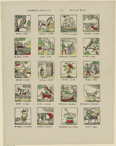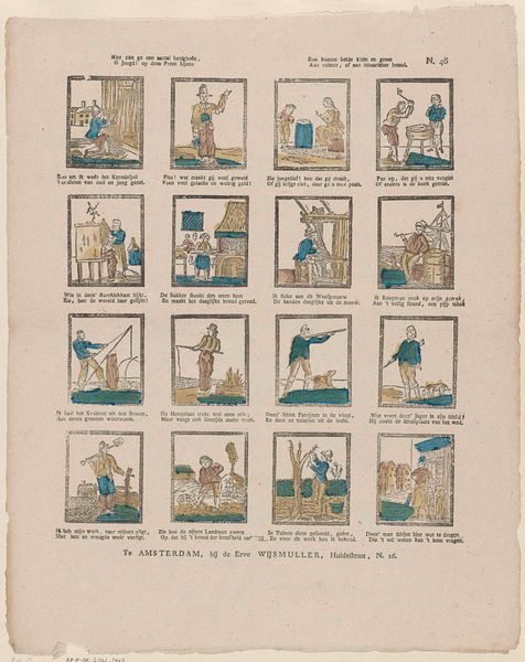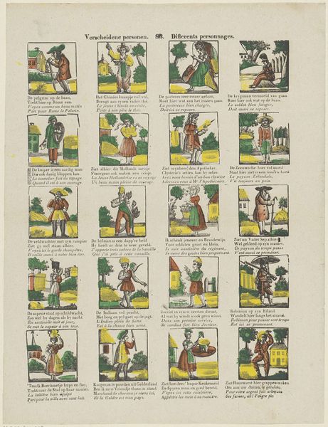 This is a page of printed images, 'Bezigheden en figuren', made by Franciscus Antonius Beersmans in the 19th century. The images are printed on paper, a mass-produced material that became increasingly available during the industrial revolution. The charm of these prints resides in the repetitive work they depict. With their carefully crafted lines and vibrant colors, each image reveals a scene from everyday life, highlighting the labor and activities of ordinary people, from soldiers to farmers. Note the scenes involving agricultural labor, commerce, and public service: these all speak to the social and economic structures of the time. While the prints may seem simple at first glance, they invite us to reflect on the labor, politics, and consumption of 19th-century society. It encourages us to look beyond traditional notions of art and recognize the skill and significance embedded in everyday imagery and the lives of common people.