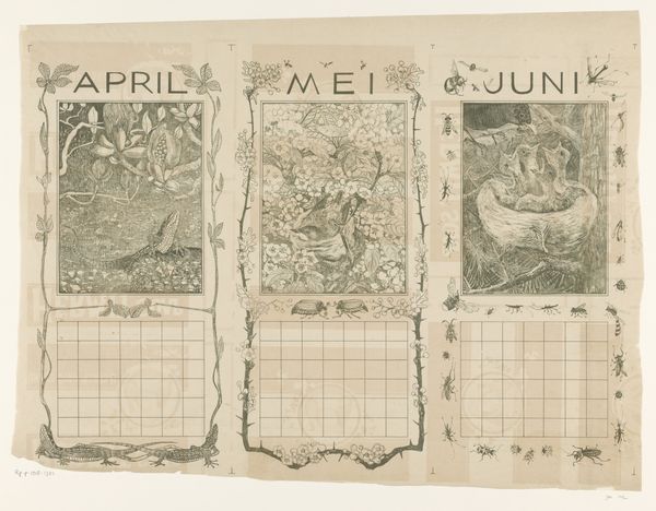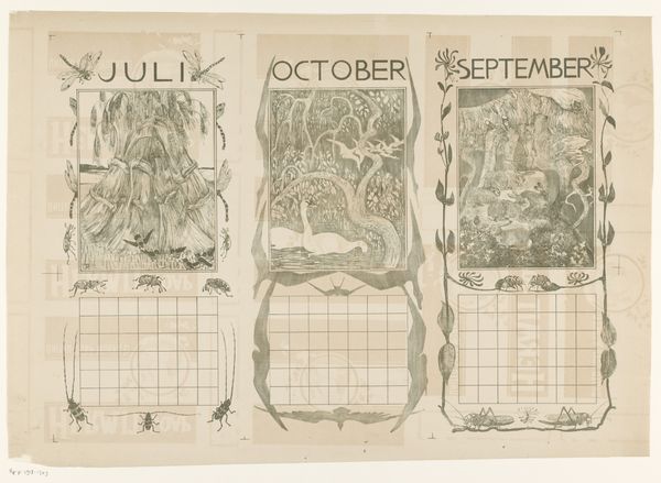 Curator: Here we have Theo van Hoytema's "Calendars for July, August and November 1910," a lithograph showcasing the artist's elegant Art Nouveau style. What’s your initial reaction to it? Editor: Well, my first impression is a sense of serene melancholy. The subdued green palette, combined with the almost ghostly figuration, evokes a quiet, contemplative mood. Curator: Absolutely. Hoytema often imbued his work with profound symbolism rooted in nature. July's flowers represent summer's abundance and vitality. But observe August's central panel—it depicts an almost translucent image, a figure which may well represent fragility, transformation perhaps linked with late summer. And what do you see there? Editor: The overall compositional structure strikes me too. The triptych-like layout, almost a study in contrasts. The density of the flowers of July versus the more ethereal presentation of the figure representing August, all culminating into a barren scenery for November, creating a nice tonal rhythm. Curator: You are right. The placement of those elements in the picture plane seems to reflect a progression towards darker days and contemplation, reflecting autumn’s somber feel. Remember that calendars not only told people what to do, but are also about seasonal change. The artist is imbuing nature with memory, creating cultural echoes across these images. Editor: It is intriguing how the stylistic details contribute to its subtle complexity, those vegetal, whiplash lines defining the frames echo the burgeoning imagery of the Art Nouveau movement itself, yet never overpowering the symbolic images within each month’s picture. It balances the ornate with the simplistic. Curator: Exactly, he captures a tension that I think he found interesting and powerful, even poignant. Van Hoytema's fascination with nature often had a melancholy edge. He believed art could reveal our deep connections to the natural world and prompt reflection on its inevitable cycles. Editor: Reflecting on the dialogue of art and cultural continuity we’ve unearthed, it is clear that by deconstructing those stylistic and pictorial decisions, we come away from this brief calendar with so much food for thought. Curator: Indeed, art reminds us that our cultural roots intertwine intimately with the natural rhythms around us.