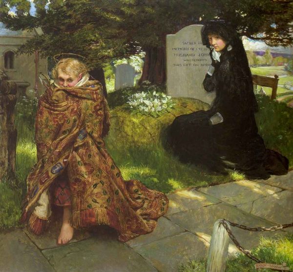 Frank O'Meara painted "Autumnal Sorrows" with oil on canvas. His artistic development took place in a cultural moment that was intensely gendered. The woman draped in black embodies a state of mourning, and the image encapsulates the Victorian era's complex relationship with death, grief, and femininity. The somber atmosphere invites contemplation on the emotional experiences of women within the social constraints of the 19th century. The second woman stands as a symbol of social support. In contrast to stereotypical representations, O'Meara sensitively conveys emotions. The backdrop, with its muted tones and natural setting, emphasizes the personal and intimate nature of grief. This portrayal reflects a broader societal interest in exploring psychological states, particularly within the domestic sphere. O'Meara creates a space for empathy, prompting us to consider the individual stories and emotional lives of women in a rapidly changing world. The painting encourages us to reflect on how societal expectations intersect with personal experiences of loss and resilience.